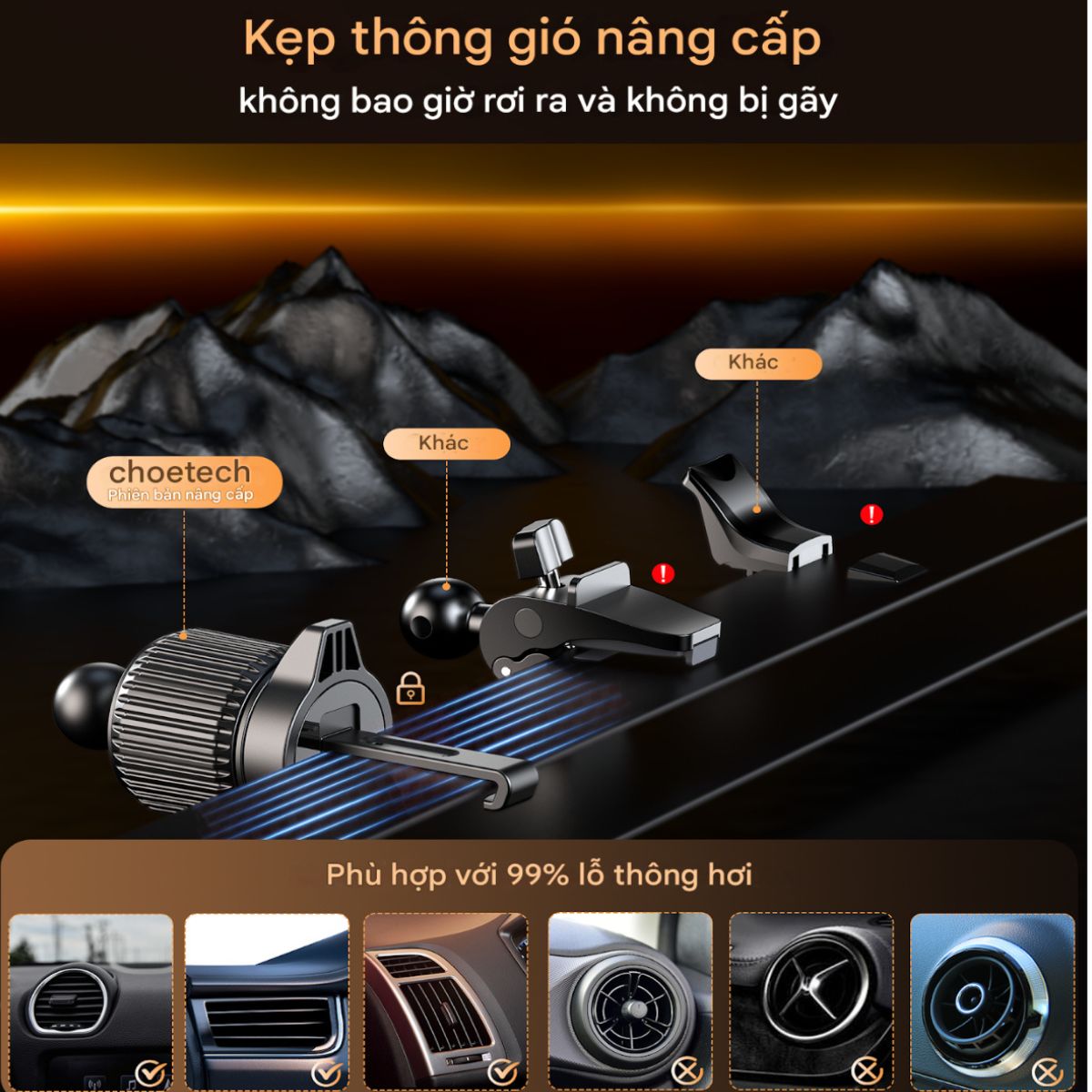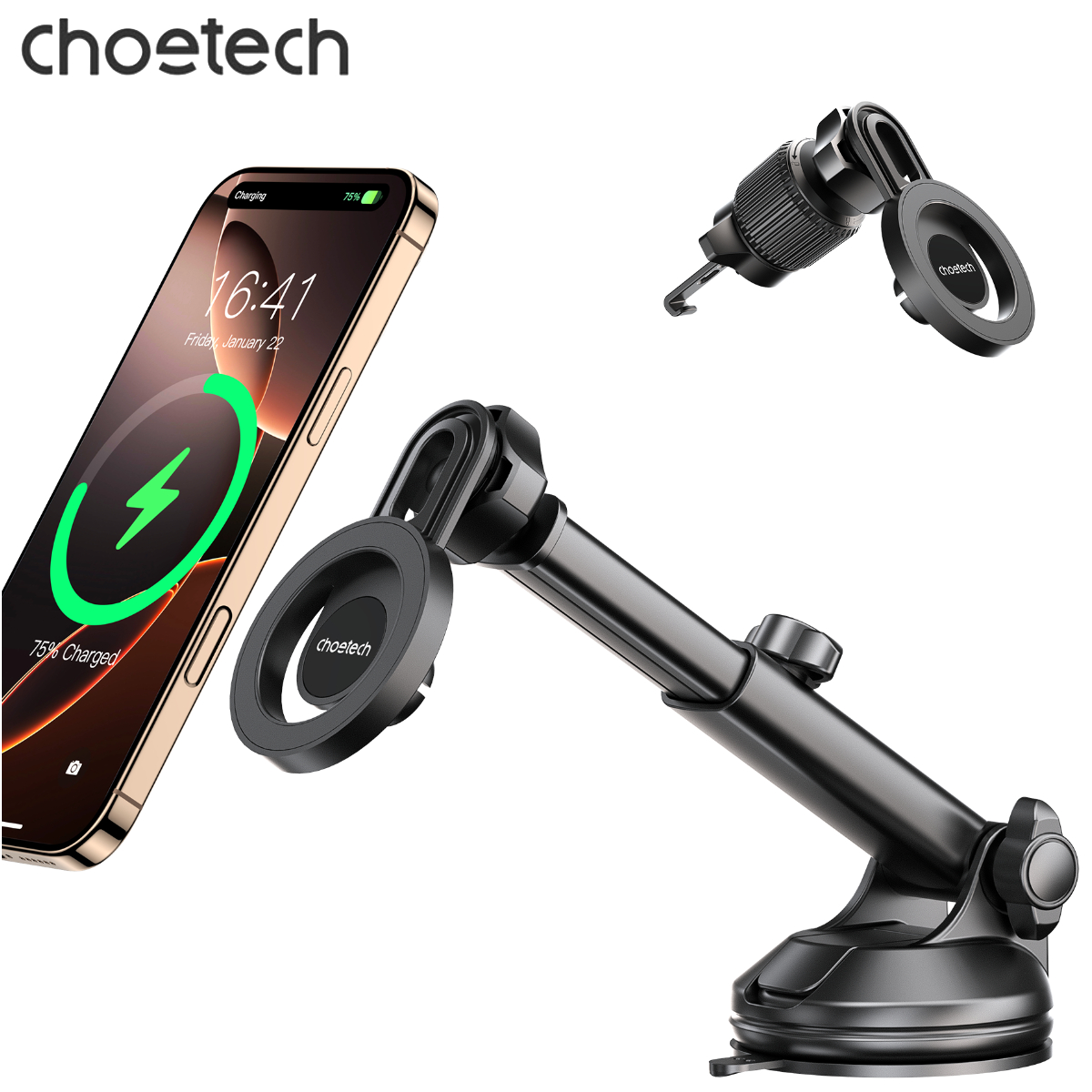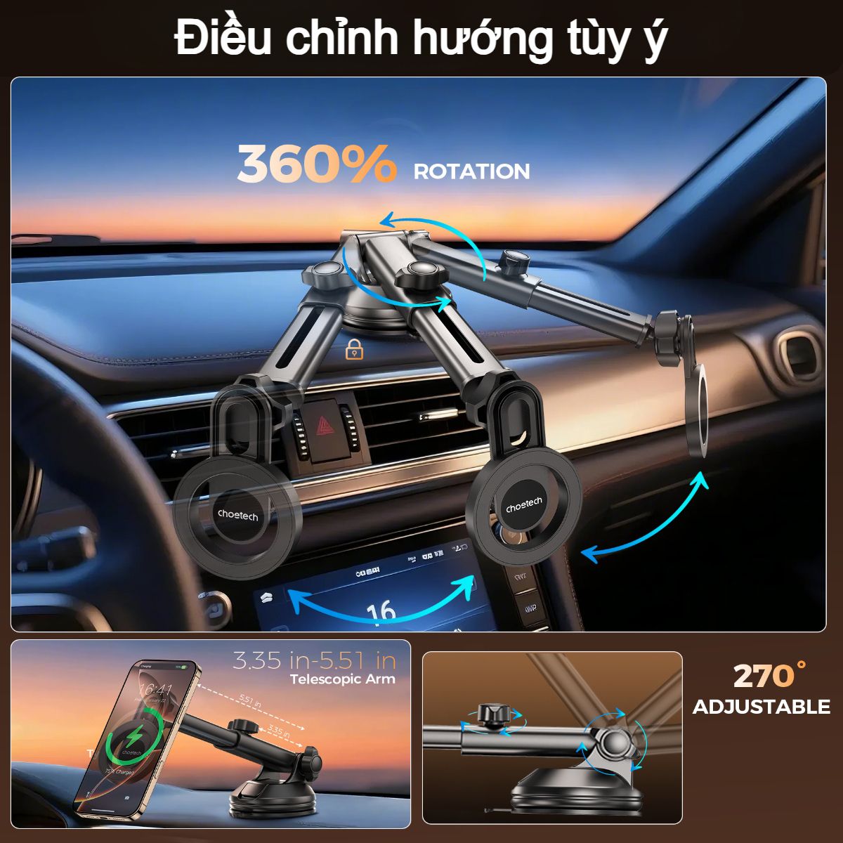 – Choetech H01005 đi kèm hai dạng gắn gồm đế hút chân không và kẹp khe gió, cho phép người dùng tùy chỉnh vị trí lắp đặt phù hợp với mọi loại xe. Cần đỡ có thể kéo dài và điều chỉnh độ cao góc nghiêng, giúp tối ưu hóa tầm nhìn khi xem bản đồ, nhận cuộc gọi hoặc sử dụng điện thoại khi dừng xe.