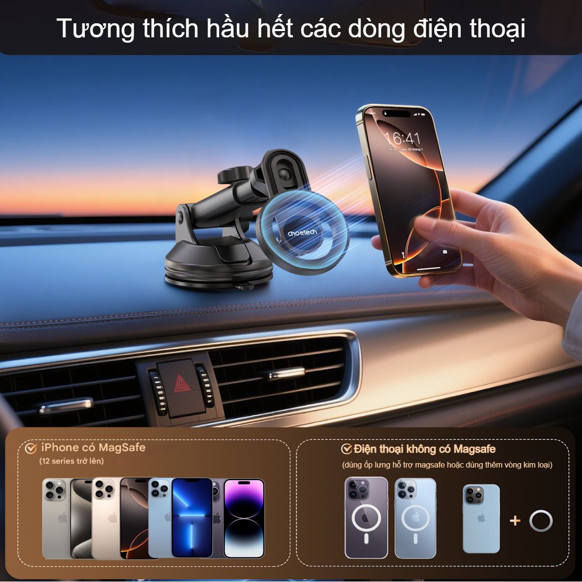 – Giá đỡ sử dụng hệ thống nam châm lực hút cao, giúp giữ chắc điện thoại ngay cả khi xe di chuyển trên địa hình gồ ghề. Sản phẩm đặc biệt tương thích với dòng iPhone có tích hợp MagSafe hoặc các thiết bị khác đã gắn vòng kim loại.