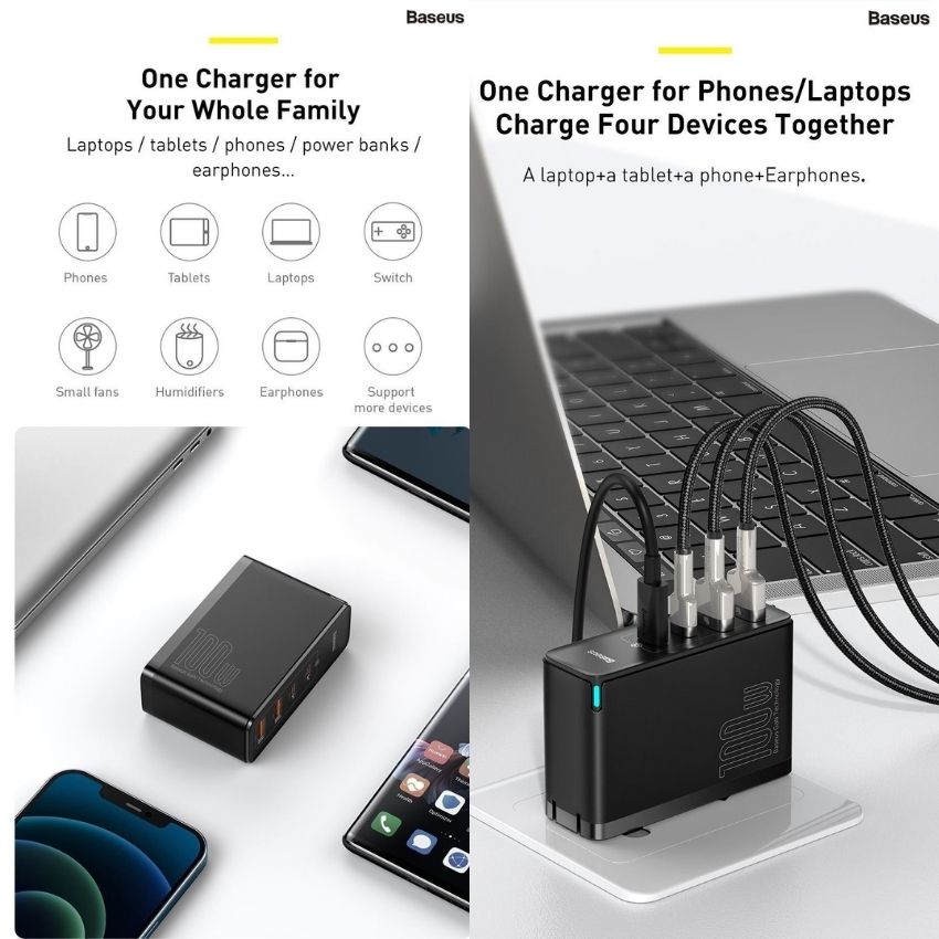 Là bộ sạc nhanh chuẩn GaN2 thế hệ mới nhất vừa được Baseus giới thiệu. Sản phẩm với 4 cổng sạc nhanh ở ngỏ ra, công suất lên đến 100W, hỗ trợ hầu như tất cả các chuẩn sạc nhanh hiện nay. Với Bộ sạc nhanh Baseus GaN2 Pro Quick Charger 4 Ports bạn chỉ cần 1 bộ sạc duy nhất cho tất cả các thiết bị của mình, giải phóng đáng kể không gian cho chiếc ba lô của bạn và dành nó cho nhiều thứ hấp dẫn hơn thay vì phải chứa vô vàn củ sạc và cáp sạc cho từng thiết bị riêng lẻ.