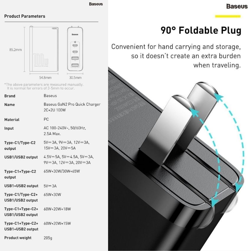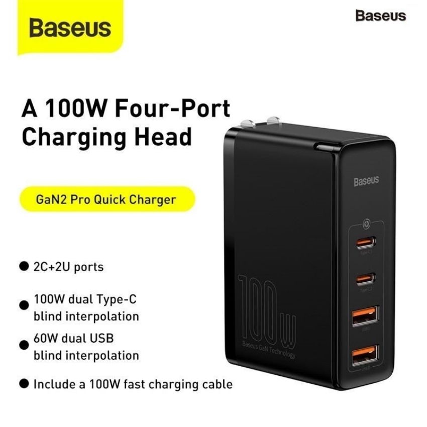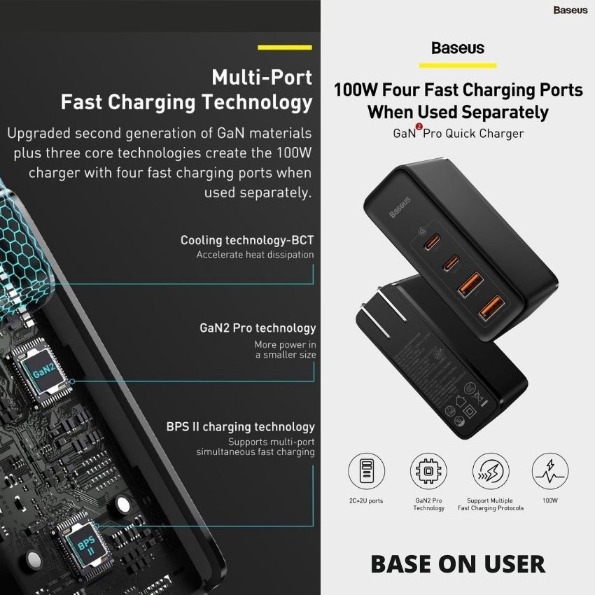 - Bộ sạc nhanh 100W Baseus GaN2 Pro Quick Charger 4 Ports (Type C*2 & USB*2) sử dụng vật liệu bán dẫn GaN thế hệ thứ 2 giúp cải thiện đáng kể hiệu suất sử dụng, tăng ổn định và khắc phục các nhược điểm của thế hệ trước đó. Khả năng bảo vệ thông minh, kiểm soát quá dòng, quá áp, quá nhiệt, chống rò điện và ngắn mạch. Bảo đảm tính ổn định cao và an toàn tuyệt đối cho thiết bị và người sử dụng.