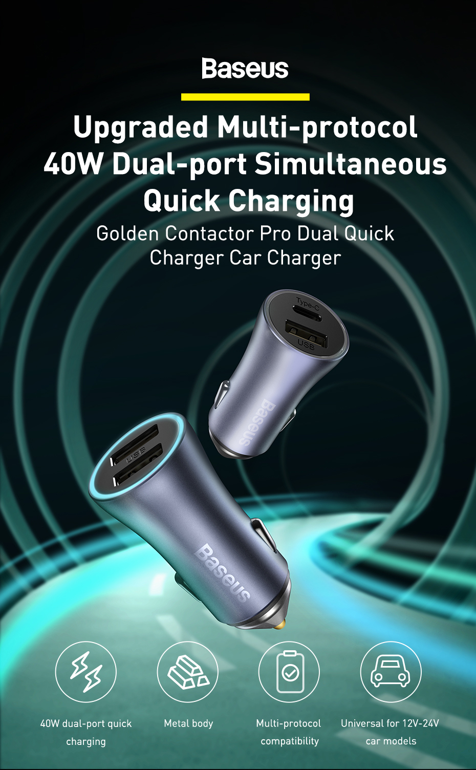 Bộ tẩu sạc ô tô Golden contactor pro dual quick charger (USB+Type C, 40w) kèm dây cáp sạc USB to type C