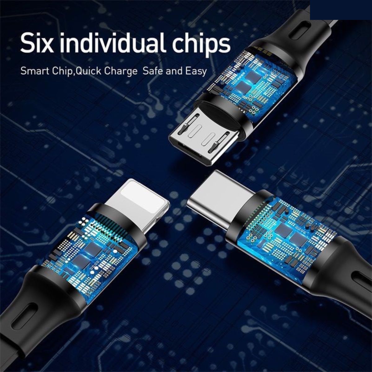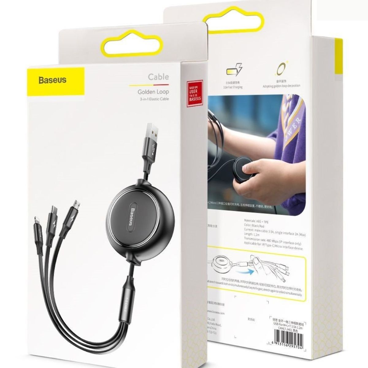 - Cáp sạc đa năng thế hệ mới Baseus Golden Loop 3 in 1 Elastic tích hợp 3 đầu kết nối Type C/ Micro USSB và Lightning dùng sạc để sạc pin cho iPhone/iPad và smartphone/tablet Android.