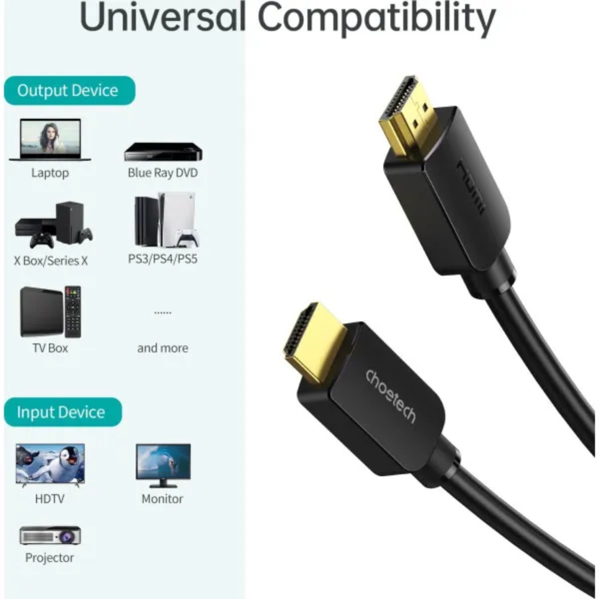 – Cáp HDMI sang HDMI 8K@60Hz Choetech XHH-TP20 được sử dụng để kết nối thiết bị phát có hỗ trợ cổng HDMI như là máy tính laptop sang các thiết bị trình chiếu như là màn máy chiếu, tivi. Có thể được áp dụng để kết nối với HDTV , truyền hình 3D, Roku, Boxee, Xbox360, PS3, Apple TV, Streaming Player, HD Cable Box, PC hoặc bất kỳ thiết bị HD.