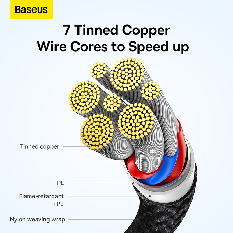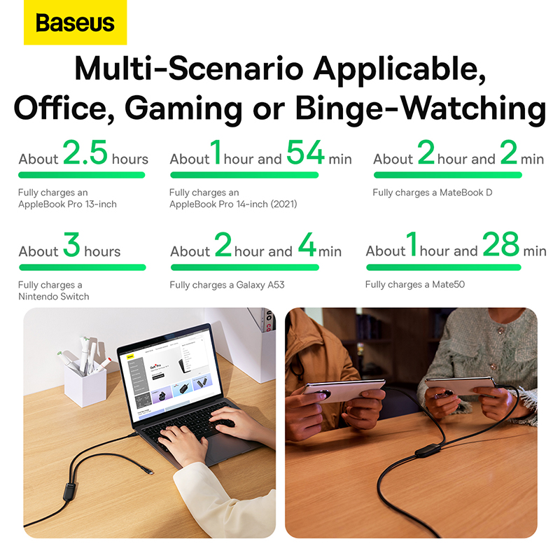 - Công suất hỗ trợ tối đa lên đến 100w (20V/ 5A khi dùng một đầu). Sản phẩm hỗ trợ sạc nhanh trên cả 2 cổng cùng lúc với công suất đầu C1 sạc nhanh 65W, đầu C2 sạc nhanh 18W. Cáp sạc Type C to Dual Type C Baseus Flash Series có thể sạc đầy Macbook Pro 13" trong vòng 2,5 giờ, sạc đầy máy Nintendo Switch trong vòng 2,5h.