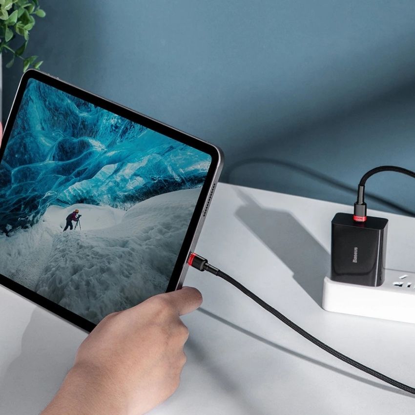- Cáp sạc nhanh type C to type C 100W CATKLF-ALG Baseus Cafule PD2.0 100W flash charging cable (100W, 20V/ 5A, 2m, Power Delivery, QC3.0 Quick Charge Cable, for iPad Pro/ Macbook/ Laptop/ Smartphone) được làm từ vỏ nhôm + TPE + dây bện mật độ cao giúp cáp sạc bền hơn, chịu lưc, chịu uống tốt hơn.