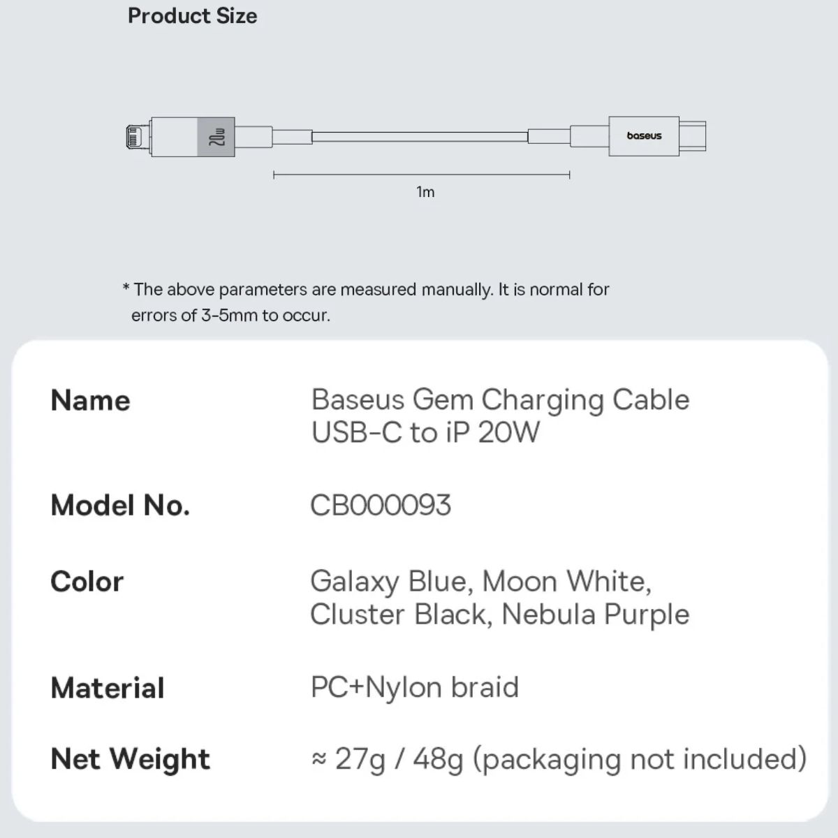 - Cáp sạc nhanh và truyền dữ liệu Type C to Lightning 20W Baseus Gem Charging Cable dài 1M và 2M là một lựa chọn không thể bỏ qua cho những ai đang tìm kiếm một giải pháp sạc nhanh, truyền tải dữ liệu ổn định và an toàn cho các thiết bị Apple. Với chất lượng vượt trội, thiết kế tinh tế và tính năng nổi bật, sản phẩm này sẽ là người bạn đồng hành lý tưởng trong cuộc sống và công việc hàng ngày.