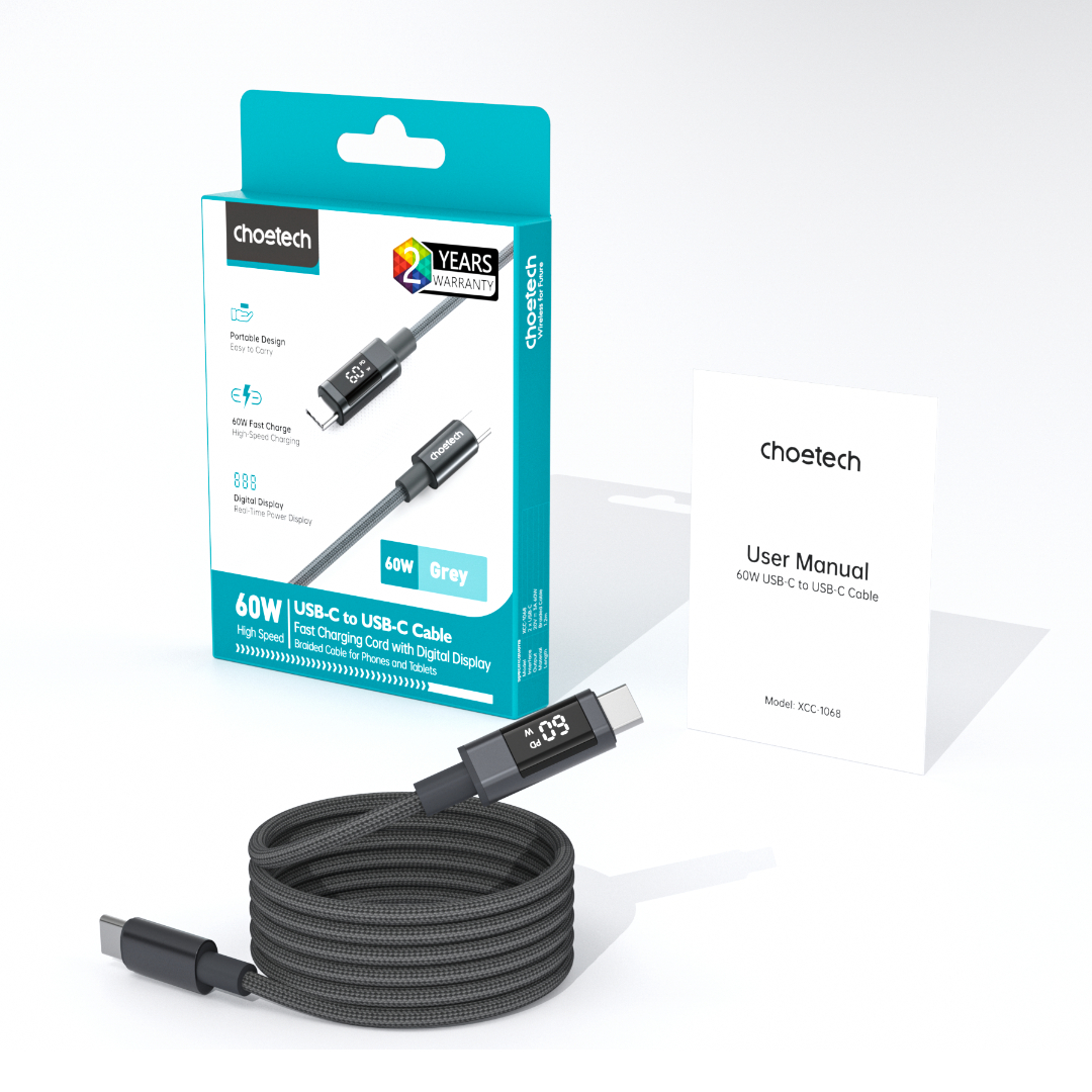 Hình ảnh Cáp sạc nhanh và truyền dữ liệu Type C to Type C 60w Choetech XCC-1068 có màn hình hiển thị thông số (Hàng chính hãng)