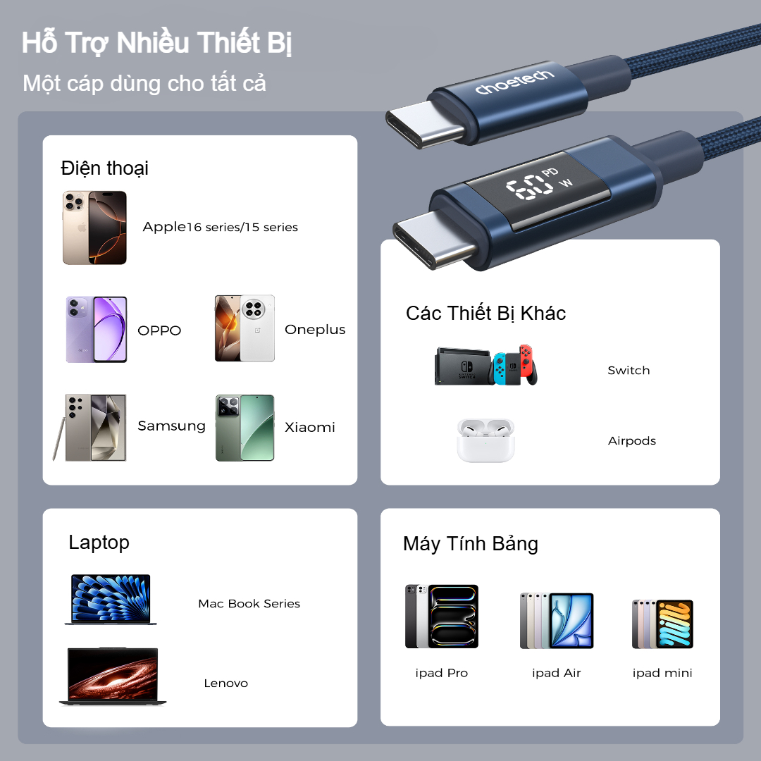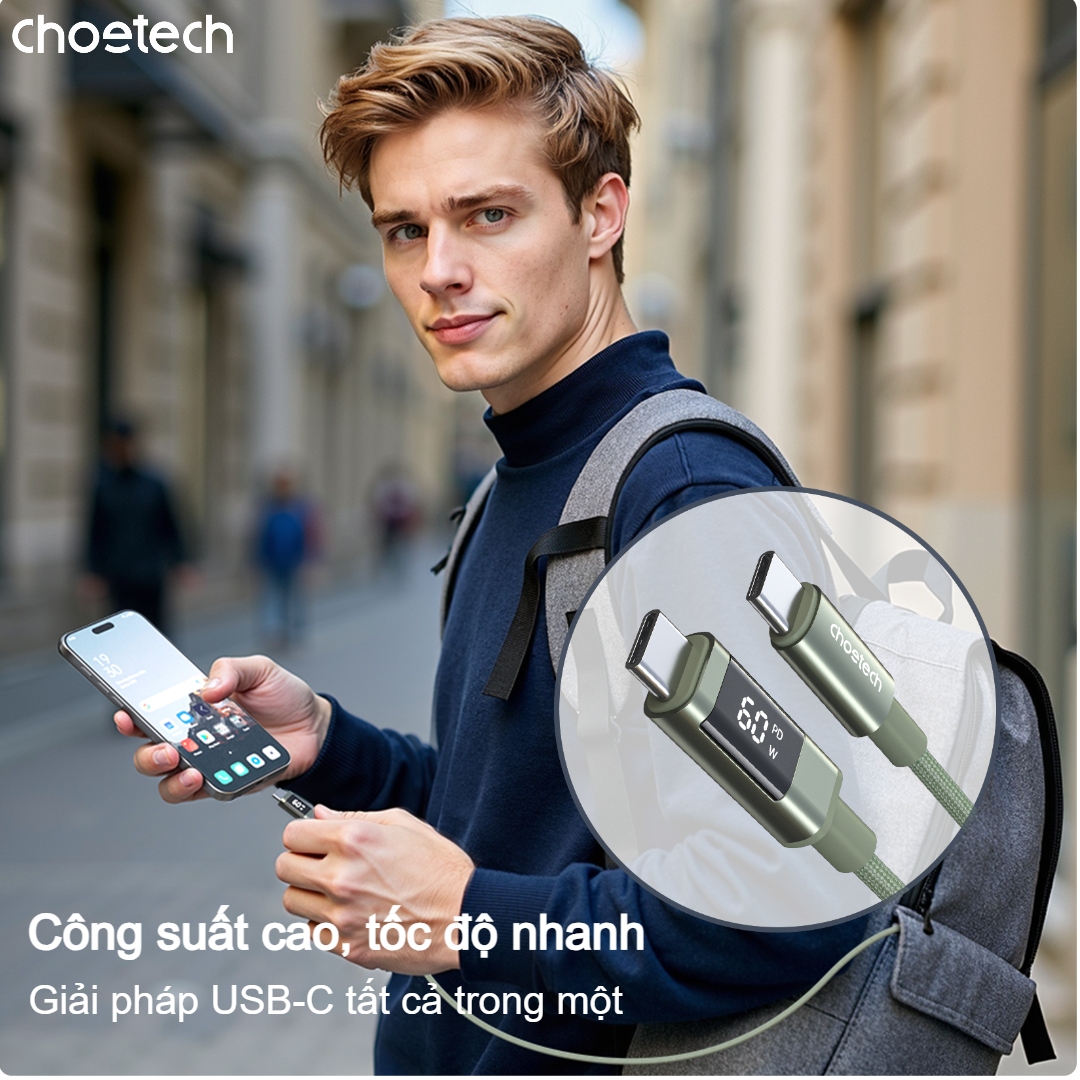 Với công suất tối đa 60W, cáp hỗ trợ công nghệ sạc nhanh PD, giúp rút ngắn đáng kể thời gian sạc cho điện thoại, máy tính bảng, laptop và nhiều thiết bị USB-C khác. Màn hình kỹ thuật số tích hợp trên đầu cáp cho phép theo dõi công suất sạc theo thời gian thực, giúp người dùng dễ dàng kiểm soát tình trạng sạc chỉ trong nháy mắt.