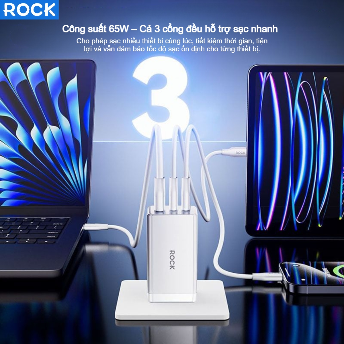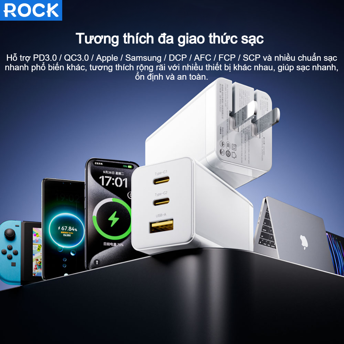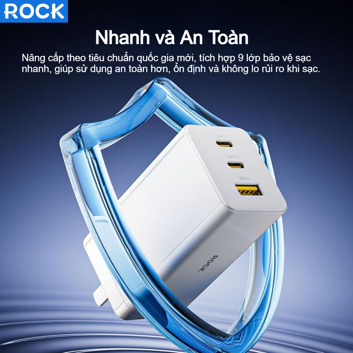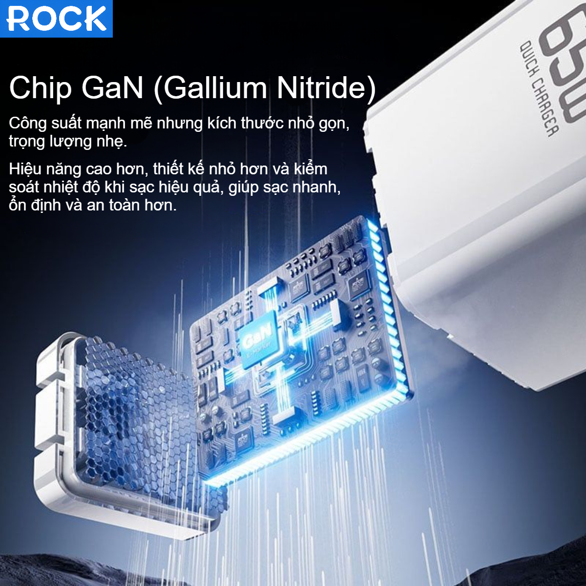 Củ Sạc Nhanh 3 Cổng ROCK C10 GaN 65W 2C+ 1U là giải pháp sạc toàn diện dành cho người dùng hiện đại, đáp ứng hoàn hảo nhu cầu sạc nhanh cho công việc, học tập, du lịch và sử dụng hằng ngày. Với thiết kế nhỏ gọn nhưng công suất mạnh mẽ, sản phẩm giúp bạn mang theo chỉ một củ sạc duy nhất để sạc nhiều thiết bị khác nhau một cách tiện lợi và an toàn.