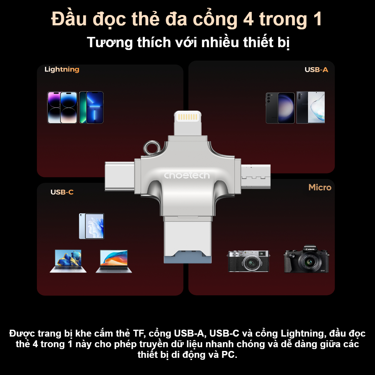 Giới thiệu Đầu đọc thẻ nhớ 4 in 1 Choetech CR-002 tốc độ cao với nhiều cổng kết nối đa năng (Hàng chính hãng)
