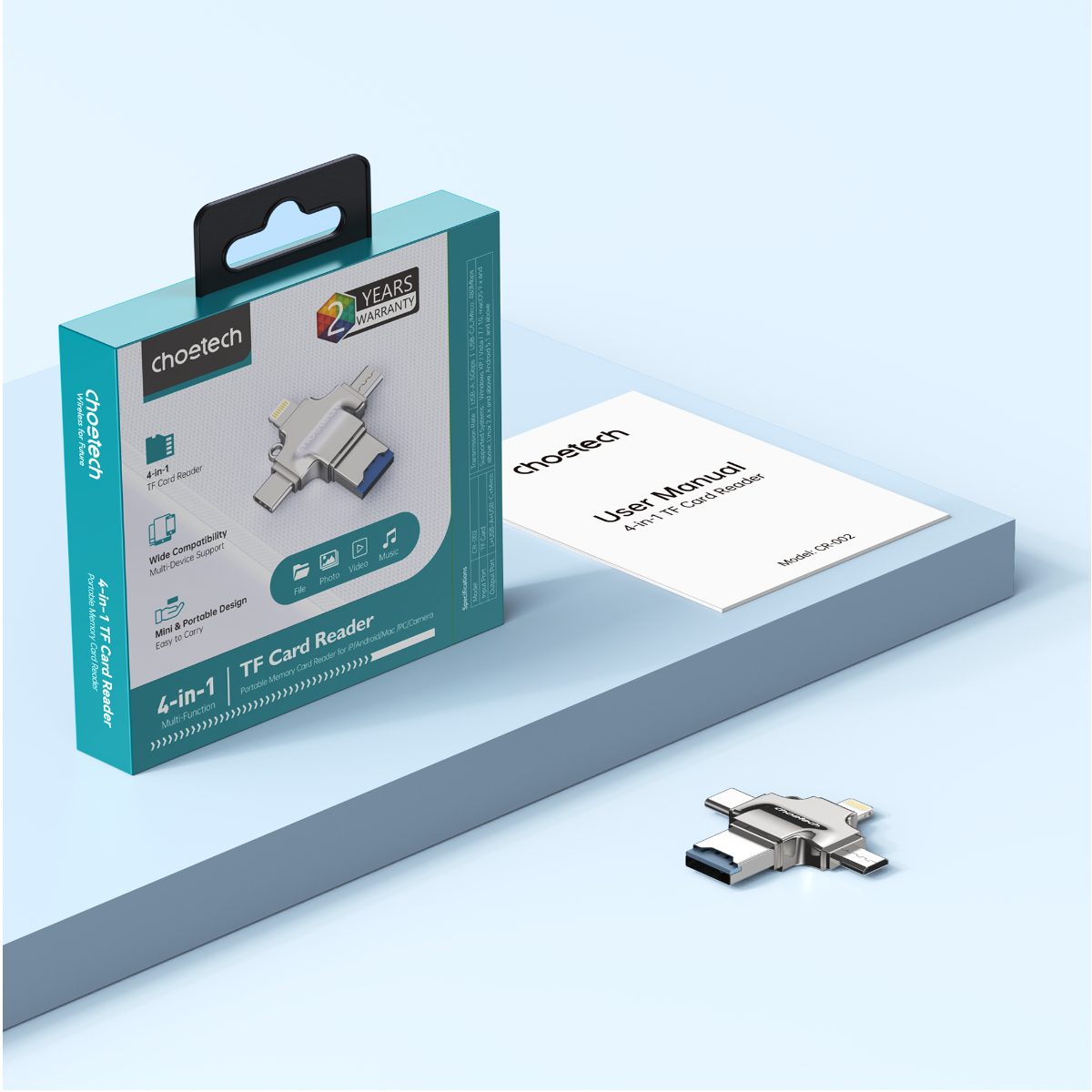Đầu đọc thẻ nhớ 4 in 1 Choetech CR-002 là phụ kiện công nghệ thông minh giúp bạn dễ dàng kết nối, chia sẻ và truyền dữ liệu giữa nhiều thiết bị khác nhau chỉ với một sản phẩm nhỏ gọn. Được thiết kế đa năng với 4 cổng kết nối gồm Usb A, Usb C, Lightning và Micro, Choetech CR-002 tương thích hoàn hảo với hầu hết điện thoại, máy tính bảng, laptop và máy ảnh hiện nay.