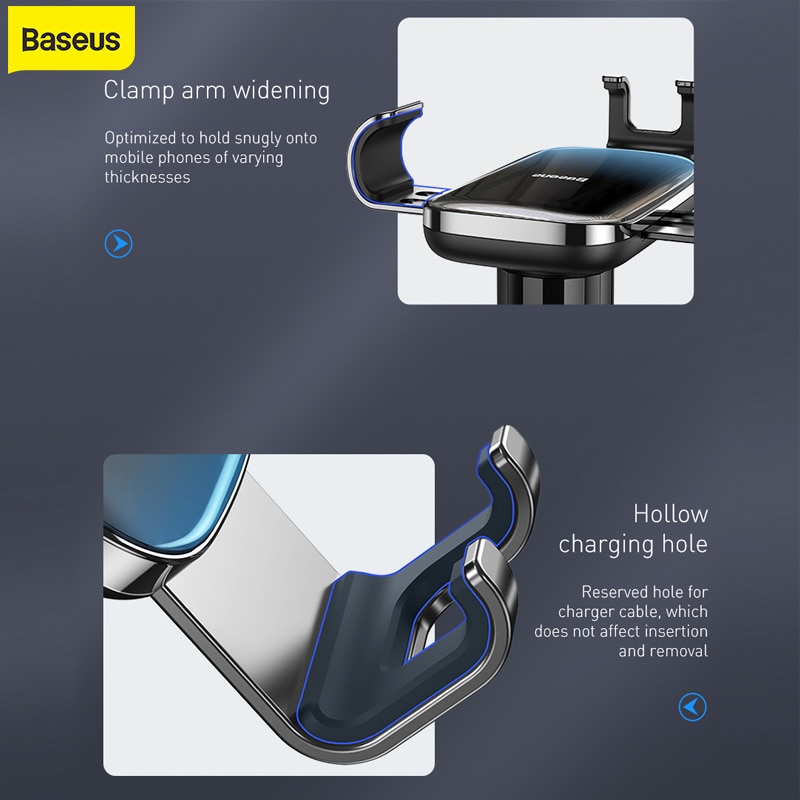 - Theo xu hướng điện thoại có kích thước và chiều dài ngày một tăng, Baseus đã cho ra mắt đế giữ Glaze Gravity với thiết kế cải tiến dễ dàng ôm được những dòng điện thoại với màn hình lớn và dài hơn đi cùng những cải tiến về kết cấu ngàm gắn ở khe gió giúp giữ điện thoại tốt hơn, hạn chế việc gảy hay xệ lá khe gió trên xe.
