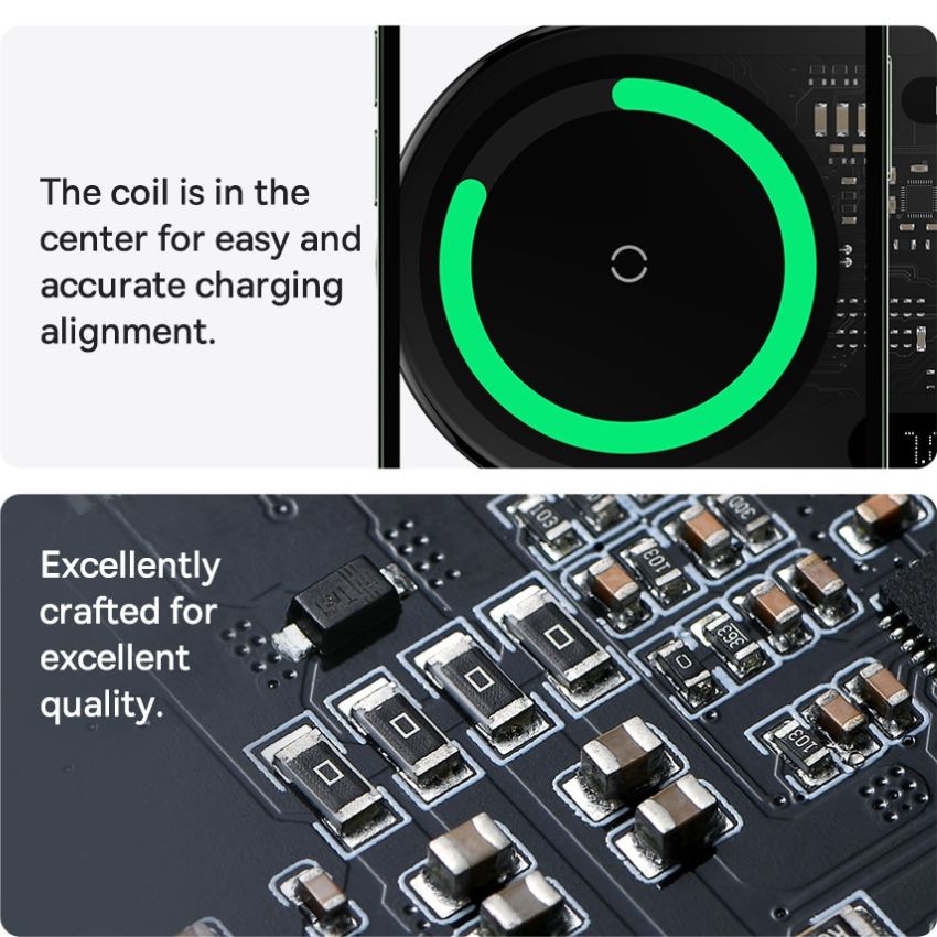 - Sản phẩm được trang bị chip xử lý nguồn thế hệ mới giúp tăng đáng kể tốc độ sạc không dây . Khả năng nhận diện thiết bị và tự động điều chỉnh công suất sạc phù hợp , đảm bảo an toàn cho từng thiết bị.