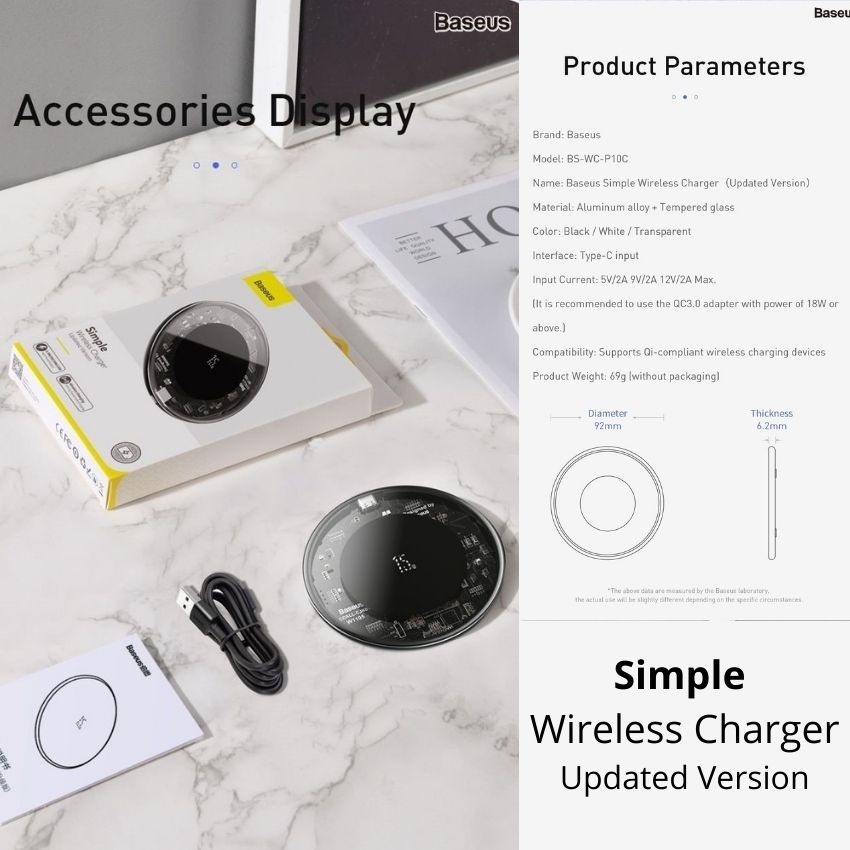 Giới thiệu chung về Đế sạc không dây siêu nhanh siêu mỏng an toàn 15W cho Iphone, Samsung, Xiaomi, Huawei, 15W Baseus Simple Wireless Charger updated Version WXJK
