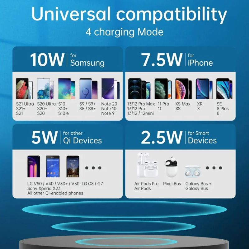 – Đế sạc sạc được chứng nhận Qi sạc công suất lên đến 10W, hỗ trợ sạc nhanh cho cả iPhone và hàng loạt model điện thoại Android khác, kể cả các thiết bị thông minh 2,5W như AirPods/Pixel Buds/Galaxy Buds… miễn là trên thiết bị có mạch nhận sạc chuẩn Qi. Hỗ trợ sạc trong khoảng cách từ 10- 35mm tùy theo loại mặt bàn mà bạn muốn gắn lên.