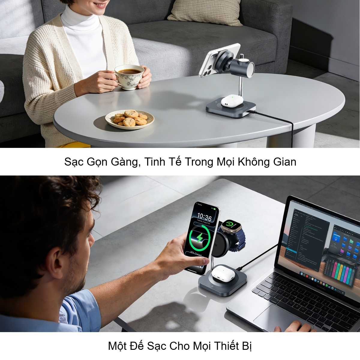 Sản phẩm hỗ trợ chuẩn sạc Qi2 mới nhất với công suất lên đến 25W cho điện thoại, mang lại tốc độ sạc nhanh và hiệu quả cho các dòng iPhone hỗ trợ MagSafe và Qi2. Lực hút từ tính chính xác giúp điện thoại cố định chắc chắn trên đế sạc, đảm bảo căn chỉnh tối ưu và giảm hao hụt năng lượng. Khu vực sạc AirPods và Apple Watch được thiết kế riêng biệt, cho phép sạc cùng lúc ba thiết bị mà vẫn đảm bảo an toàn và ổn định.