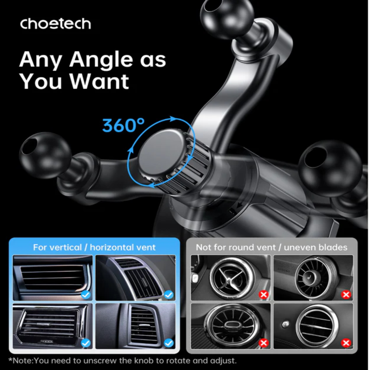- Thiết kế kẹp chắc chắn giúp cố định giá đỡ lên khe gió điều hòa ô tô, đảm bảo độ ổn định và không gây cản trở không gian nội thất.
