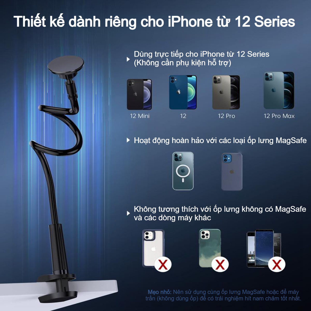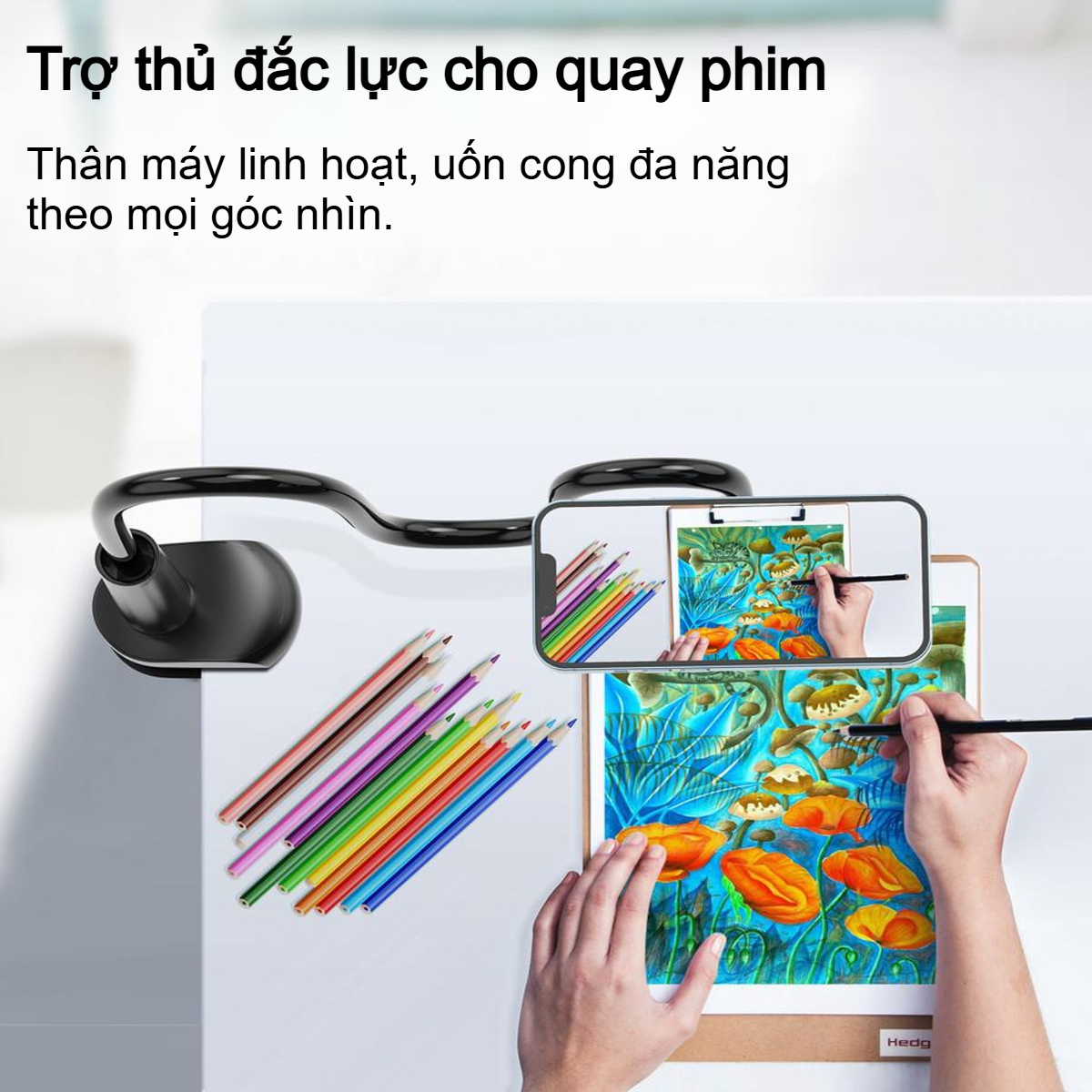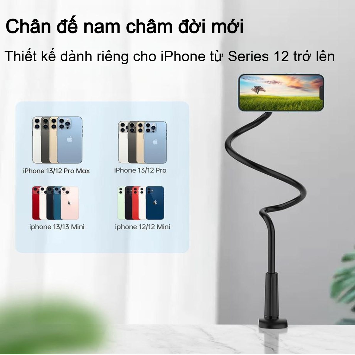 Phần đầu giữ điện thoại được thiết kế với khớp xoay cầu thông minh, cho phép bạn xoay điện thoại theo chiều dọc, chiều ngang hoặc bất kỳ góc độ nào bạn muốn. Khả năng xoay 360 độ kết hợp cùng thân uốn linh hoạt giúp bạn dễ dàng tìm được góc nhìn chống chói và thoải mái nhất cho cổ và vai gáy.