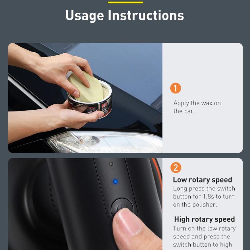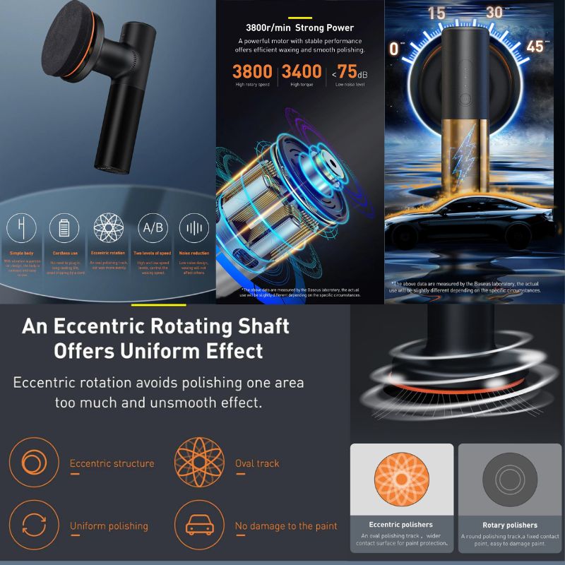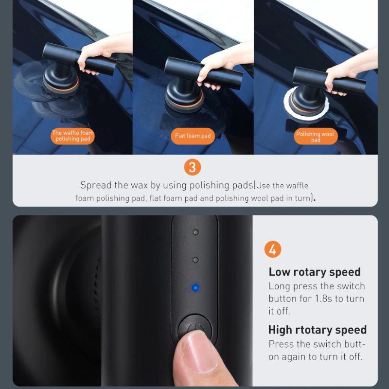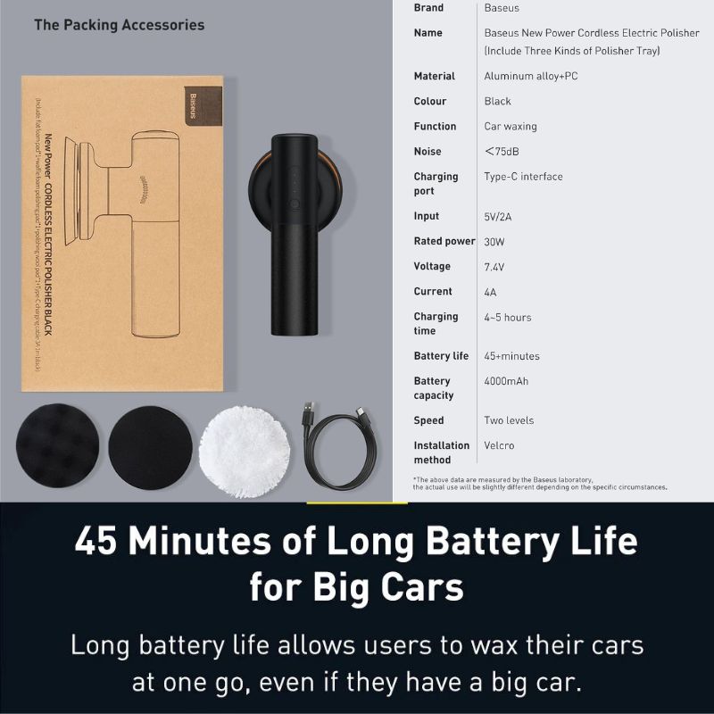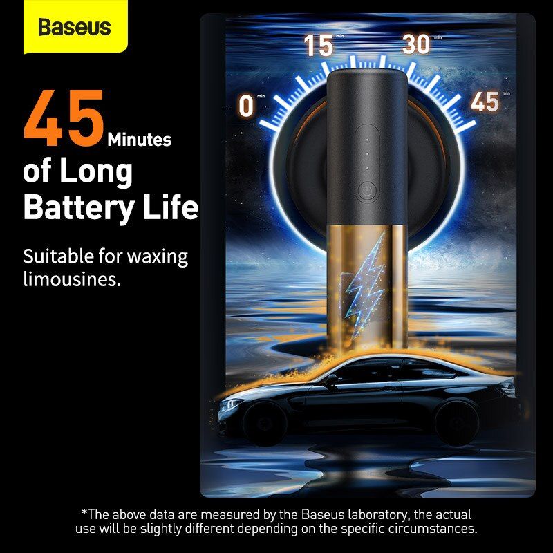 - Máy được trang bị dung lượng pin 4000 mAh cho thời gian sử dụng liên tục lên đến 45 phút tính năng khởi động mềm và tốc độ không đổi giúp việc đánh bóng ô tô hay các bề mặt sẽ trở nên dễ dàng hơn, đánh bóng được theo chiều dọc với tốc độ ổn định, di chuyển linh hoạt kể cả trong không gian chật hẹp. Dữ liệu trên được đo bởi Phòng thí nghiệm Baseus.