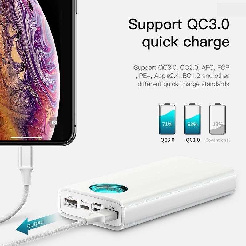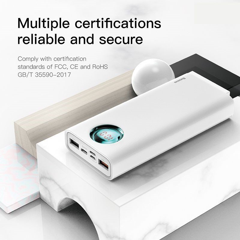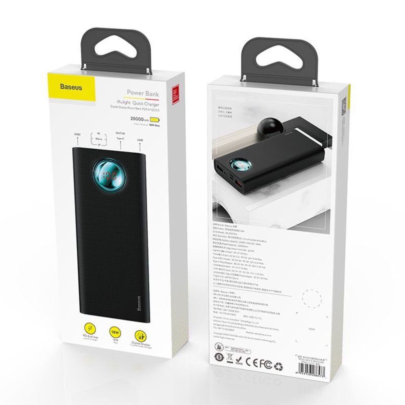 - Dược tích hợp chíp xử lý nguồn thế hệ mới có hiệu suất sử dụng cao, độ ổn định vượt trội cùng với cơ chế bảo vệ thông minh. Pin dự phòng sạc nhanh 20000mAh, 18W PPALL-LG Baseus Amblight Quick charge Digital display Power bank PD/QC3.0 cho mức điện áp sử dụng ổn định, đảm bảo an toàn cho thiết bị và người sử dụng.
