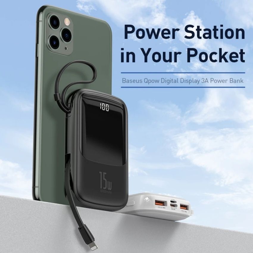 PIN SẠC DỰ PHÒNG BASEUS QPOW DIGITAL DISPLAY 3A 10.000MAH KÈM CÁP IPHONE CHÍNH HÃNG được tích hợp bộ xử lý thông minh có khả năng tự động nhận diện thiết bị và điều chỉnh mức điện áp và dòng điện phù hợp cùng khả năng ngăn ngừa quá tải và ngắn mạch. Đặc biệt bộ sạc còn có chế độ tự ngắt sau khi sạc đầy pin, không làm nóng máy, bảo vệ an toàn tuyệt đối cho thiết bị của bạn.