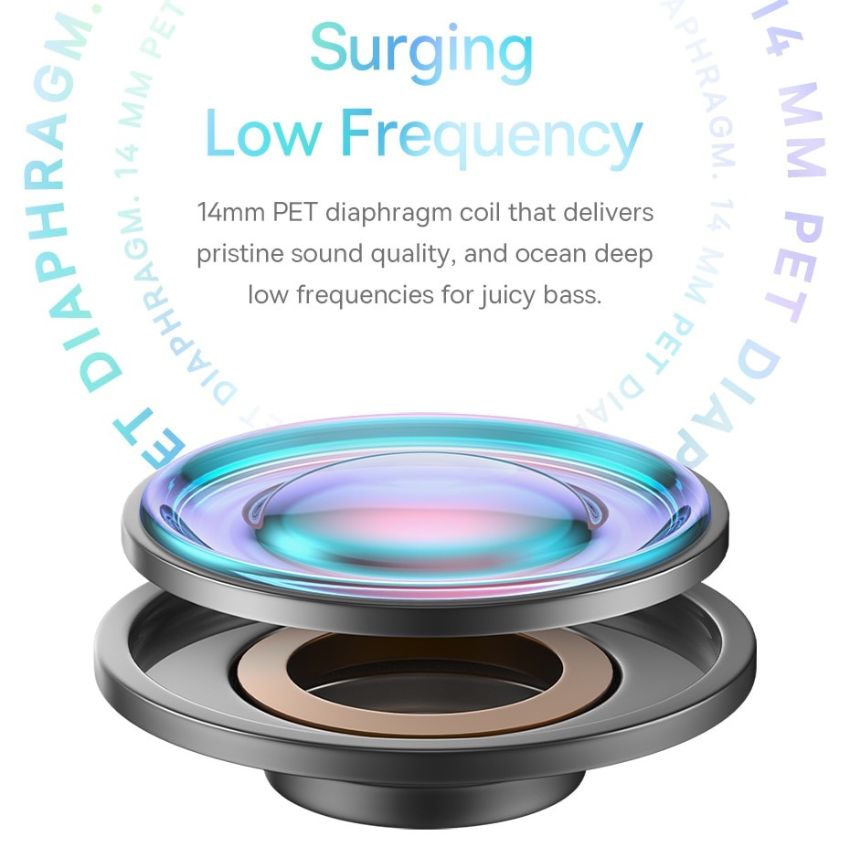 - Với độ trễ chỉ 0.06s tạo cảm giác thoải mái khi chơi game. Tần số thấp 14 DIAP Cuộn dây màng PET 14mm mang đến chất lượng âm thanh nguyên bản và tần số thấp sâu của đại dương cho âm trầm tuyệt.