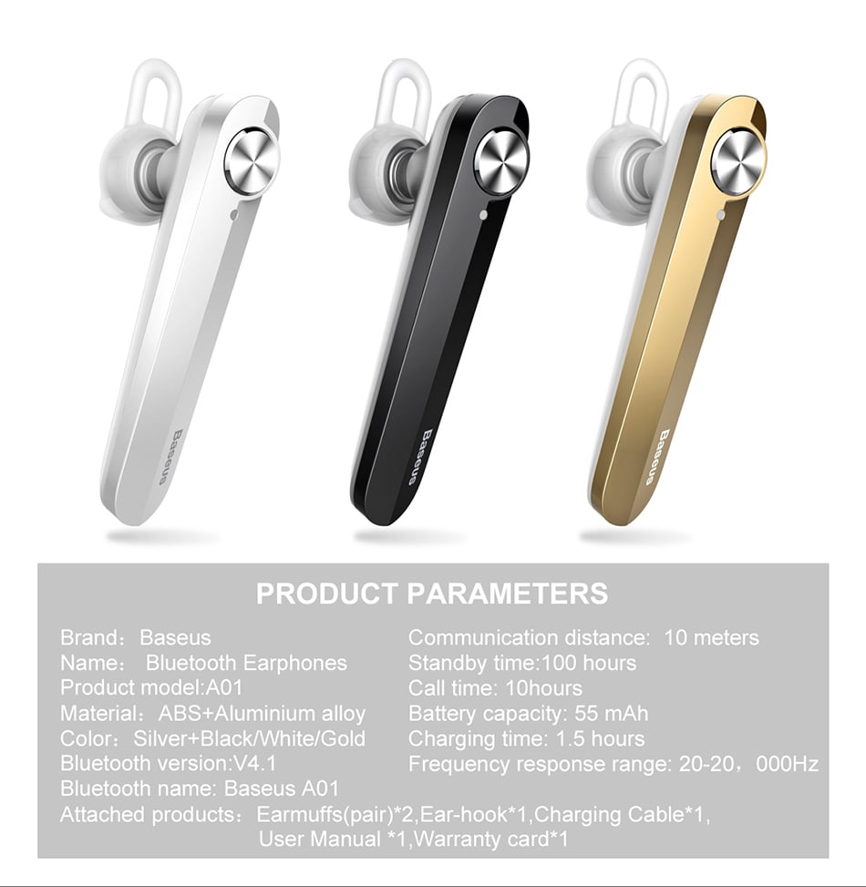 - Sử dụng pin sạc Litium , dung lượng pin 55mAh cho thời gian gọi điện liên tục lên tới 10h. Baseus A01 sử dụng công nghệ HD voice lọc âm, chống ồn hiệu quả, phạm vi đáp ứng tần số: 20-20000Hz.