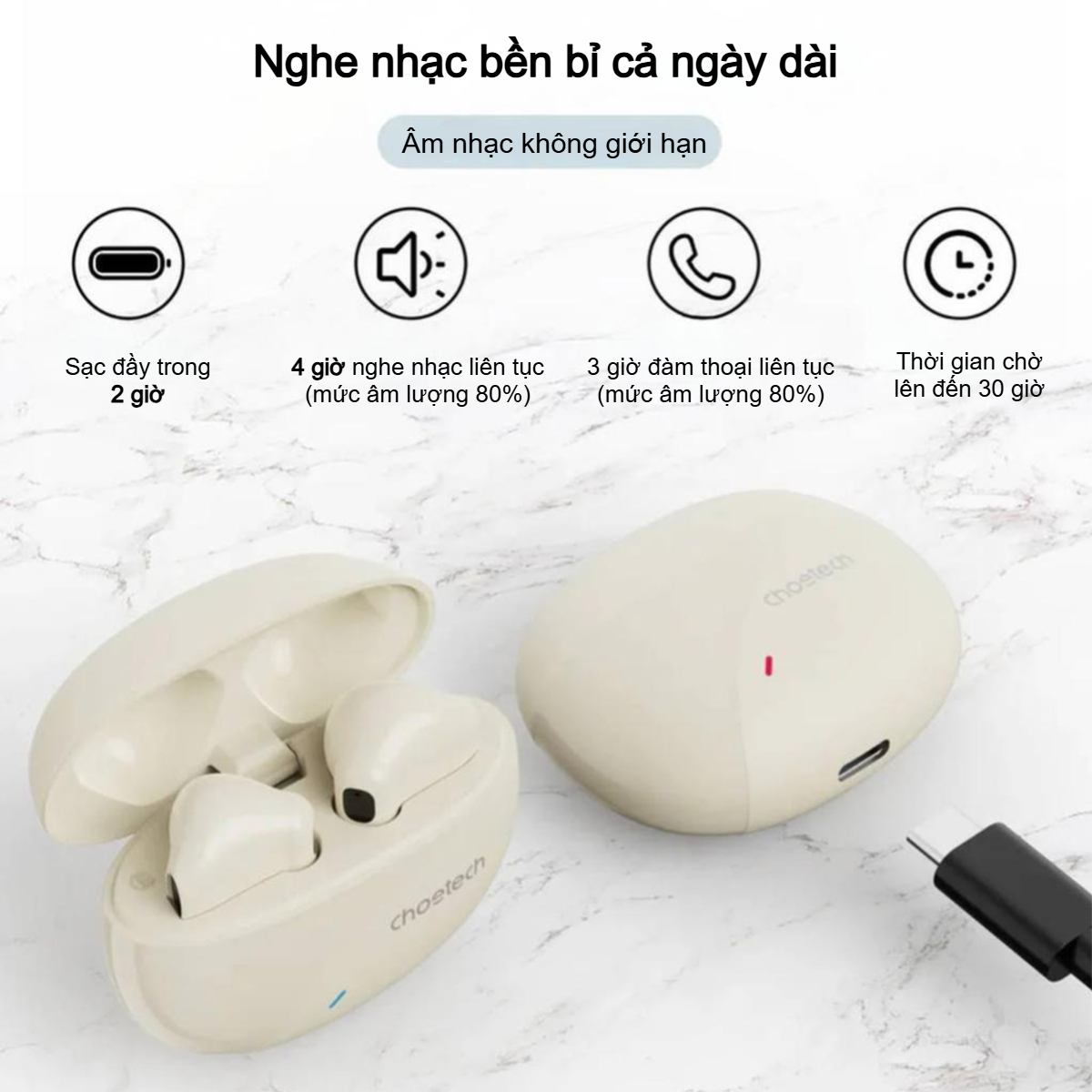 Đừng để vẻ ngoài nhỏ gọn đánh lừa, Choetech BH-T24 sở hữu hiệu năng pin đáng kinh ngạc. Chỉ với 1.5 giờ sạc nhanh, mỗi bên tai nghe dung lượng 30mAh có thể phát nhạc liên tục trong 4 giờ ở mức âm lượng 80 phần trăm.