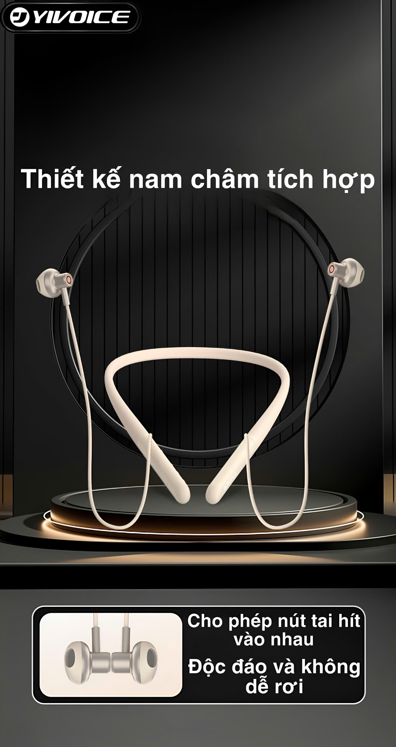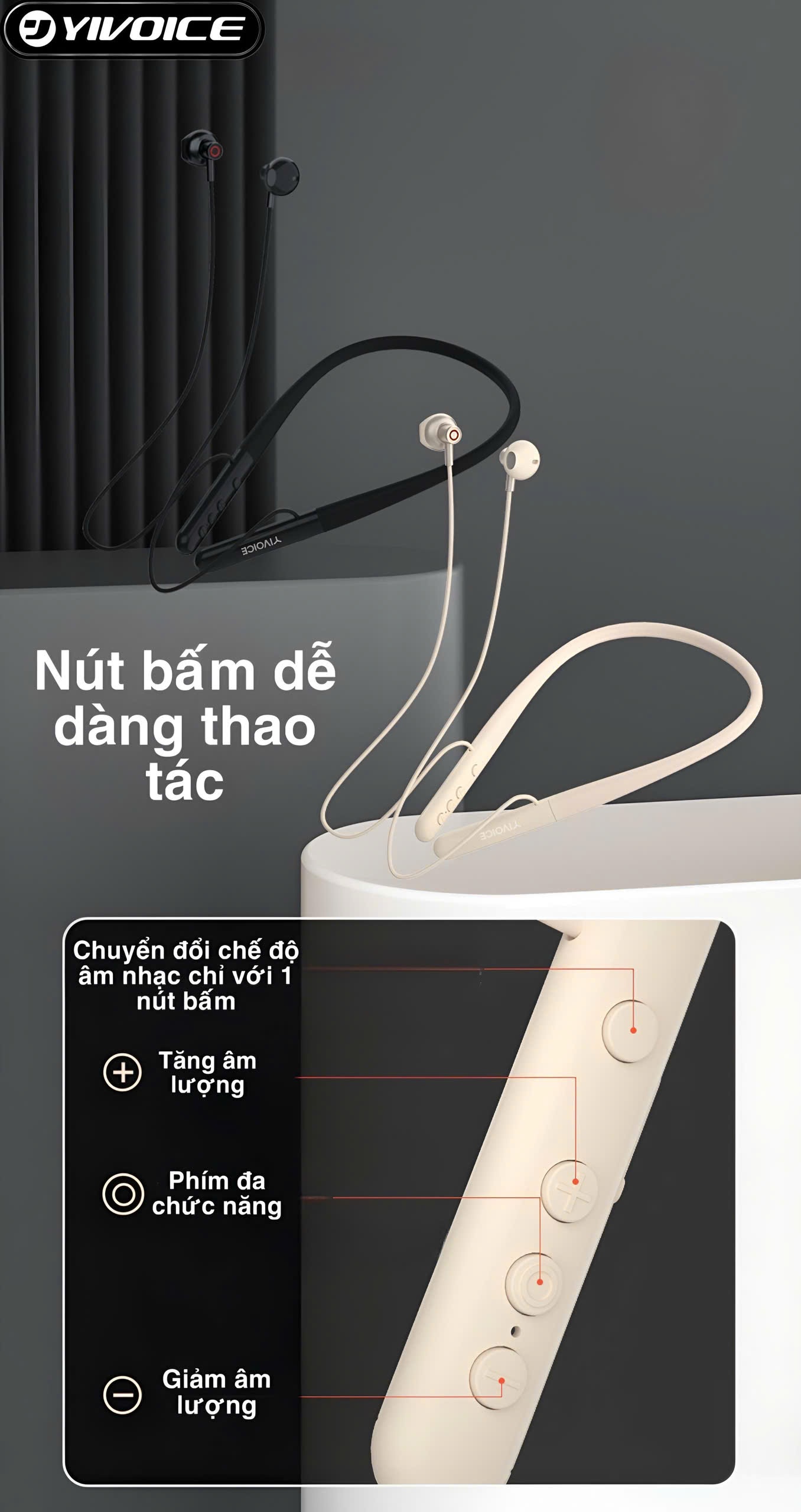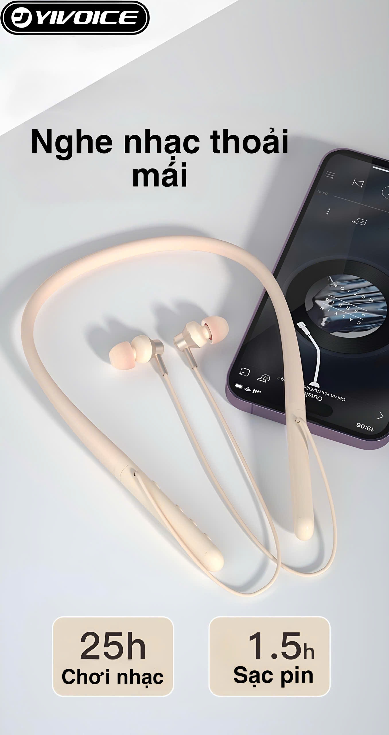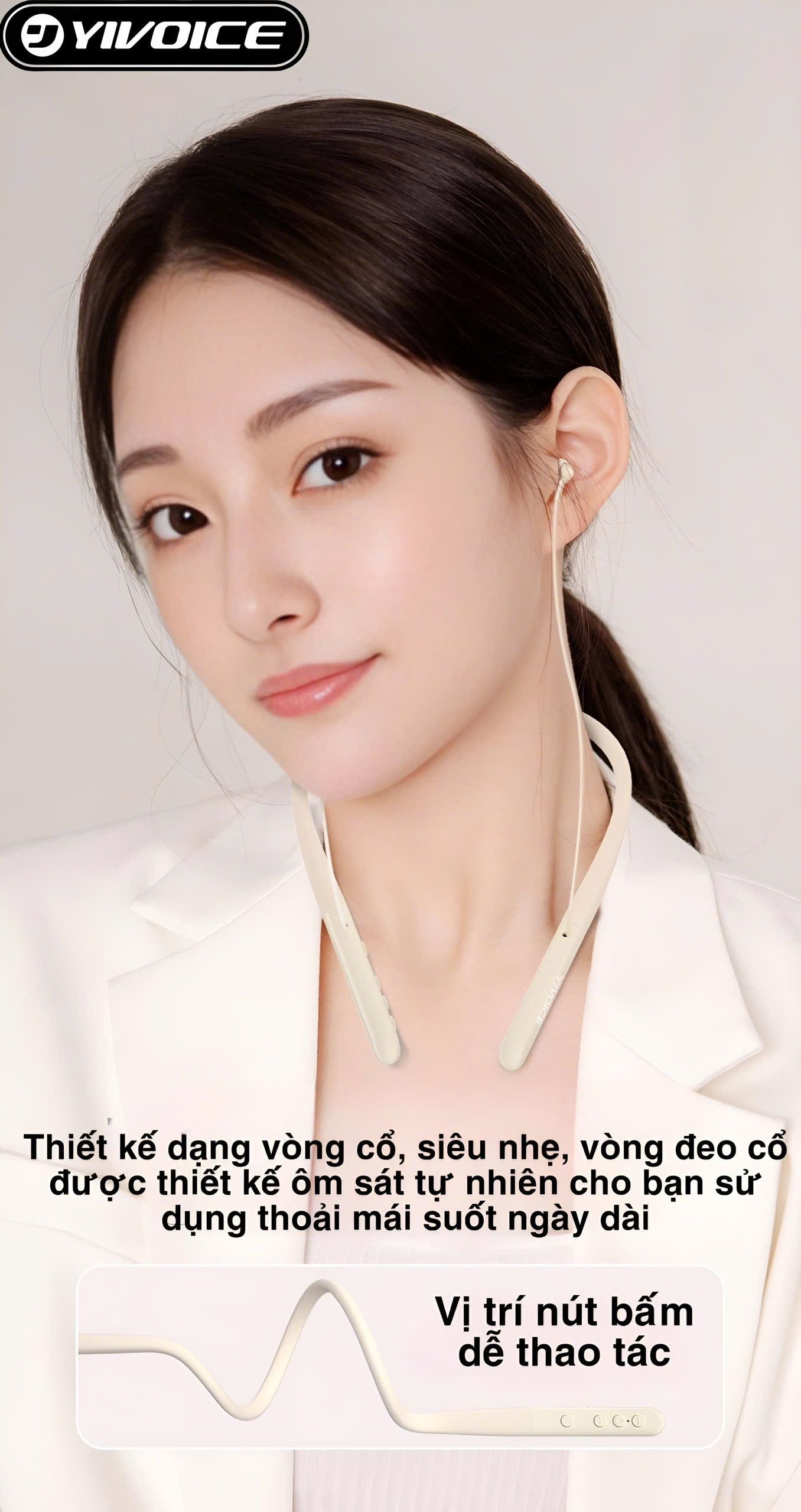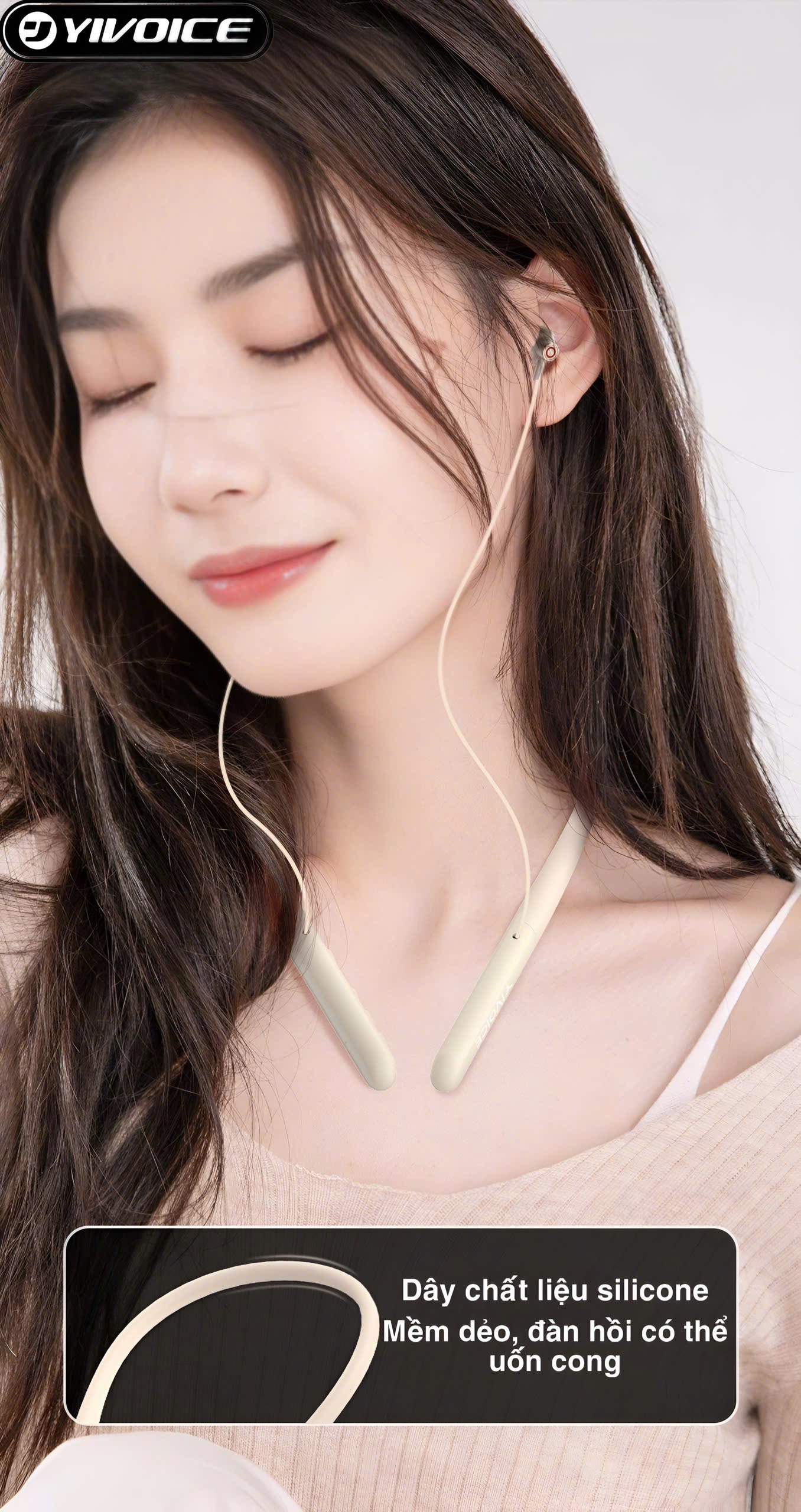 - Tai Nghe Bluetooth Thể Thao Choàng Cổ YIVOICE Y50 và YIVOICE Y60 được thiết kế với kiểu dáng thể thao năng động, phù hợp cho các hoạt động thể chất như chạy bộ, tập gym, hoặc đi xe đạp. Với thiết kế dây choàng cổ nhẹ nhàng và linh hoạt, tai nghe này mang lại sự thoải mái tối đa khi sử dụng trong thời gian dài mà không gây cảm giác vướng víu. Đầu tai nghe được trang bị đệm silicon mềm mại, vừa vặn và ôm sát tai, giúp hạn chế việc rơi rớt khi vận động mạnh.