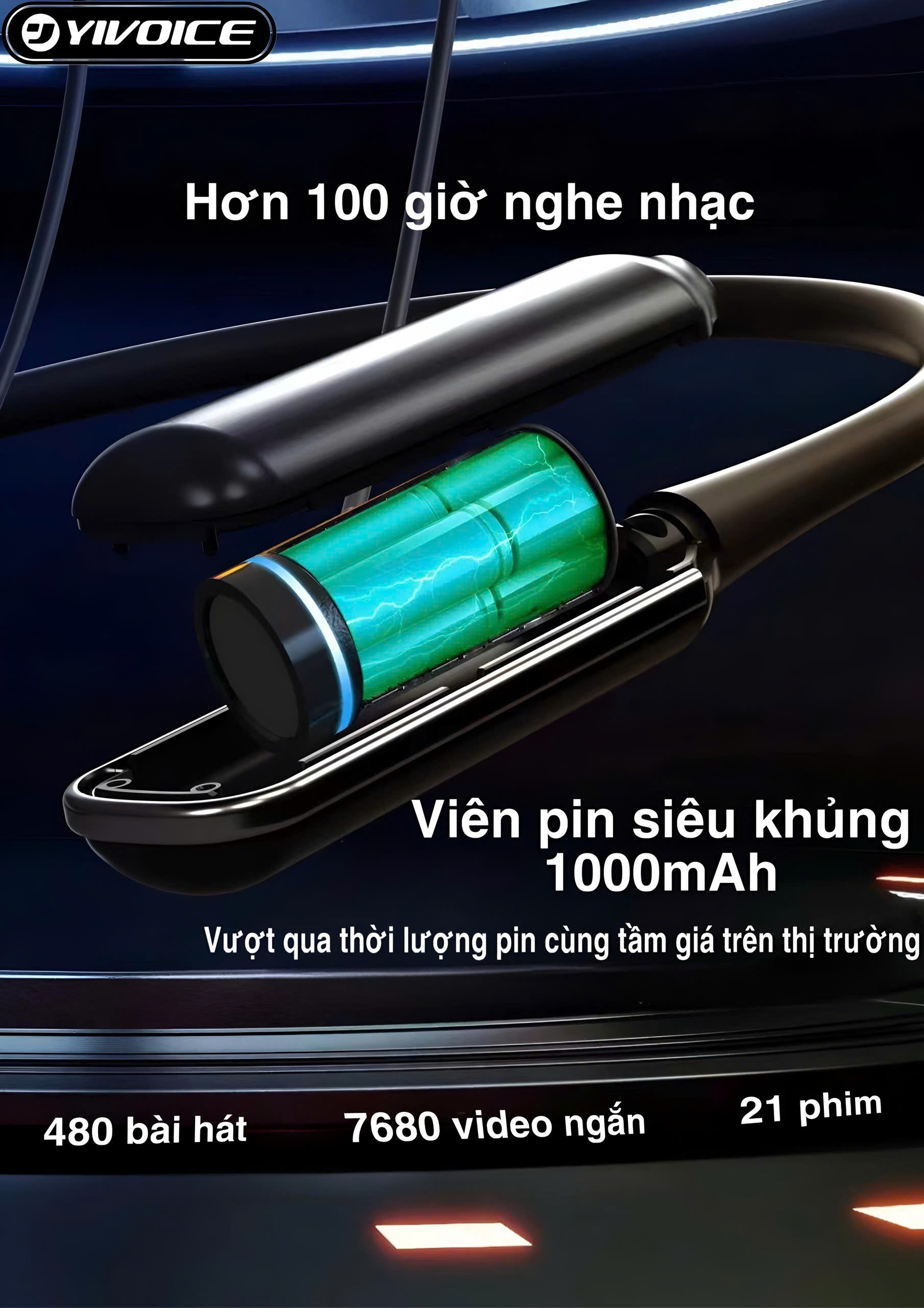 - Điểm nổi bật nhất của YIVOICE Y90 và YIVOICE Y100 chính là viên pin dung lượng 750mAh, mang lại thời gian nghe nhạc liên tục lên đến 50 giờ và thời gian chờ lên đến 1000 giờ. Điều này biến tai nghe trở thành một trong những lựa chọn lý tưởng cho những ai thường xuyên di chuyển hoặc tham gia các chuyến đi dài mà không có điều kiện sạc pin thường xuyên. Bạn có thể sử dụng tai nghe trong nhiều ngày mà không cần lo lắng về việc hết pin.