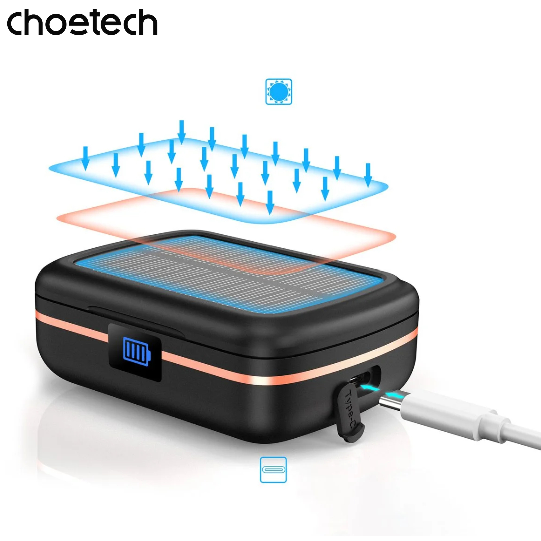 Điểm nổi bật của tai nghe Bluetooth thể thao Choetech BH-T05 nằm ở hộp sạc thông minh tích hợp tấm pin năng lượng mặt trời. Ngoài khả năng sạc bằng cáp USB C thông thường, hộp sạc có thể được nạp pin bằng ánh nắng tự nhiên, rất phù hợp để duy trì năng lượng trong các chuyến đi xa hoặc khi không có nguồn điện. Tai nghe sẽ tự động sạc khi được đặt vào hộp và chỉ báo pin giúp người dùng dễ dàng theo dõi trạng thái pin.