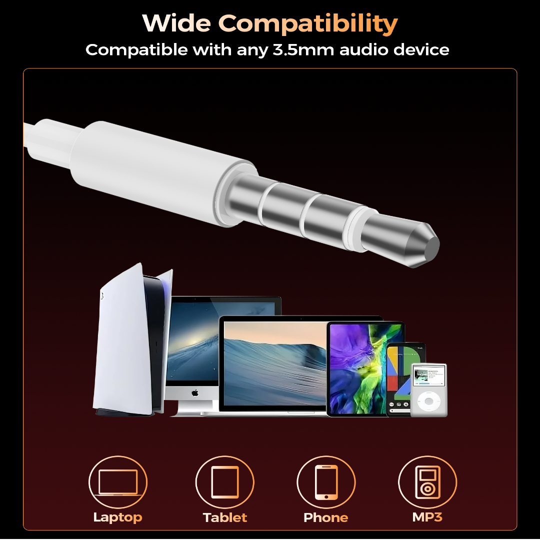 Sản phẩm sử dụng jack cắm 3.5mm tương thích với hầu hết điện thoại, máy tính bảng, laptop và các thiết bị âm thanh phổ biến. Dây dài 1.2 m được làm từ chất liệu ABS và TPE bền bỉ, hạn chế rối và chịu uốn tốt, đảm bảo sử dụng lâu dài trong nhiều điều kiện khác nhau.