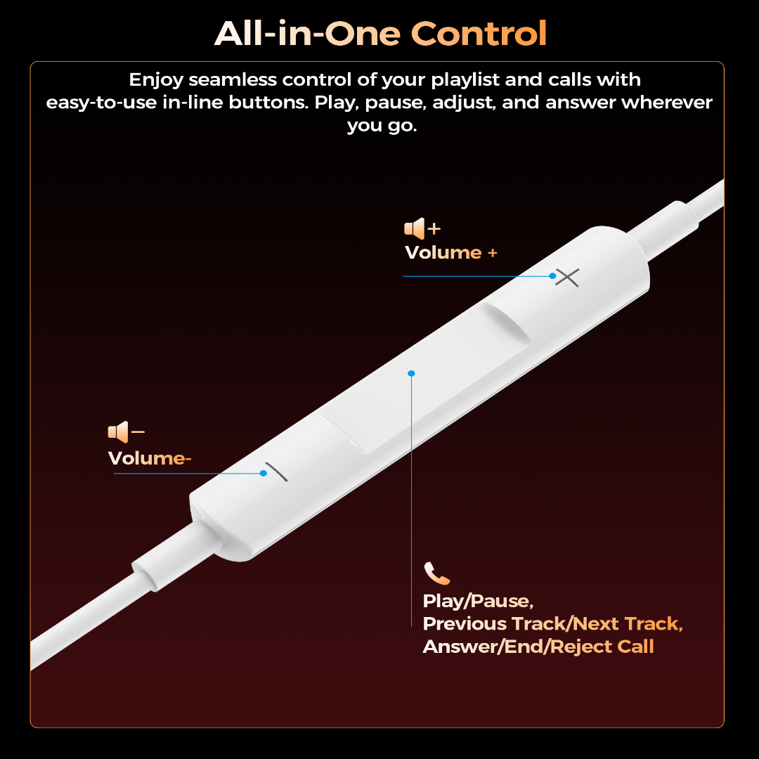 Tai nghe còn được tích hợp phím điều khiển tiện lợi ngay trên dây, cho phép người dùng dễ dàng phát hoặc tạm dừng nhạc, chuyển bài hát và nhận hoặc kết thúc cuộc gọi. Micro hỗ trợ đàm thoại cho chất lượng thoại rõ ràng, giúp liên lạc thuận tiện mọi lúc.