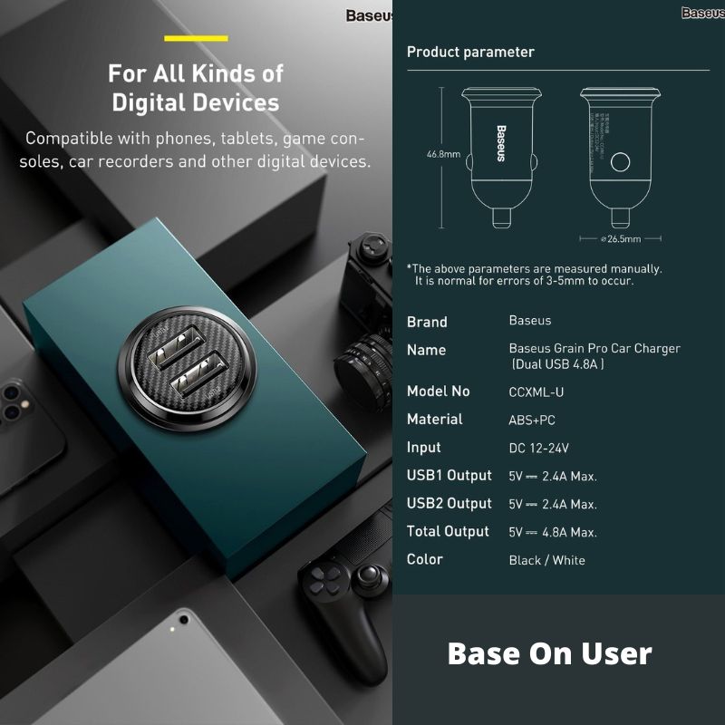 - Bộ tẩu Baseus Grain Pro Car Charger thuộc dòng sản phẩm tẩu sạc đa năng dùng cho xe hơi của Baseus. Đây là phiên bản nâng cấp thế hệ thứ 4 của dòng tẩu sạc này với kích thước siêu nhỏ gọn và được trang bị 2 cổng sạc USB tiện dụng.