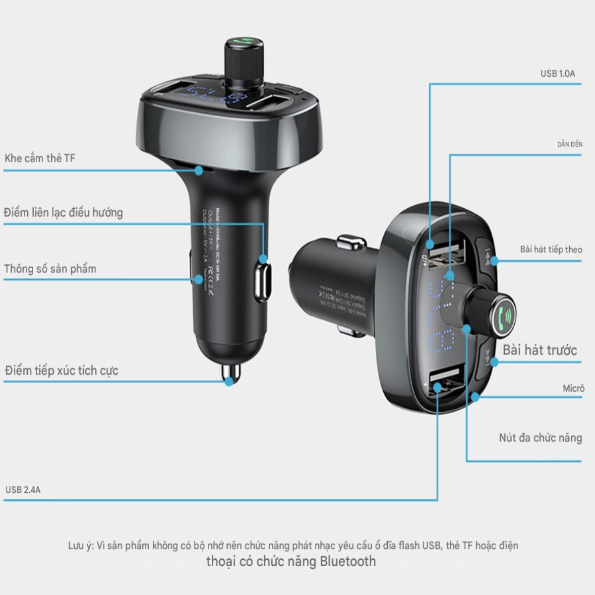 - Thiết bị tương thích với hầu hết các dòng xe hơi có cổng tẩu 12V đến 24V. Ngoài ra, hỗ trợ kết nối với điện thoại iOS và Android, cùng các thiết bị Bluetooth khác.