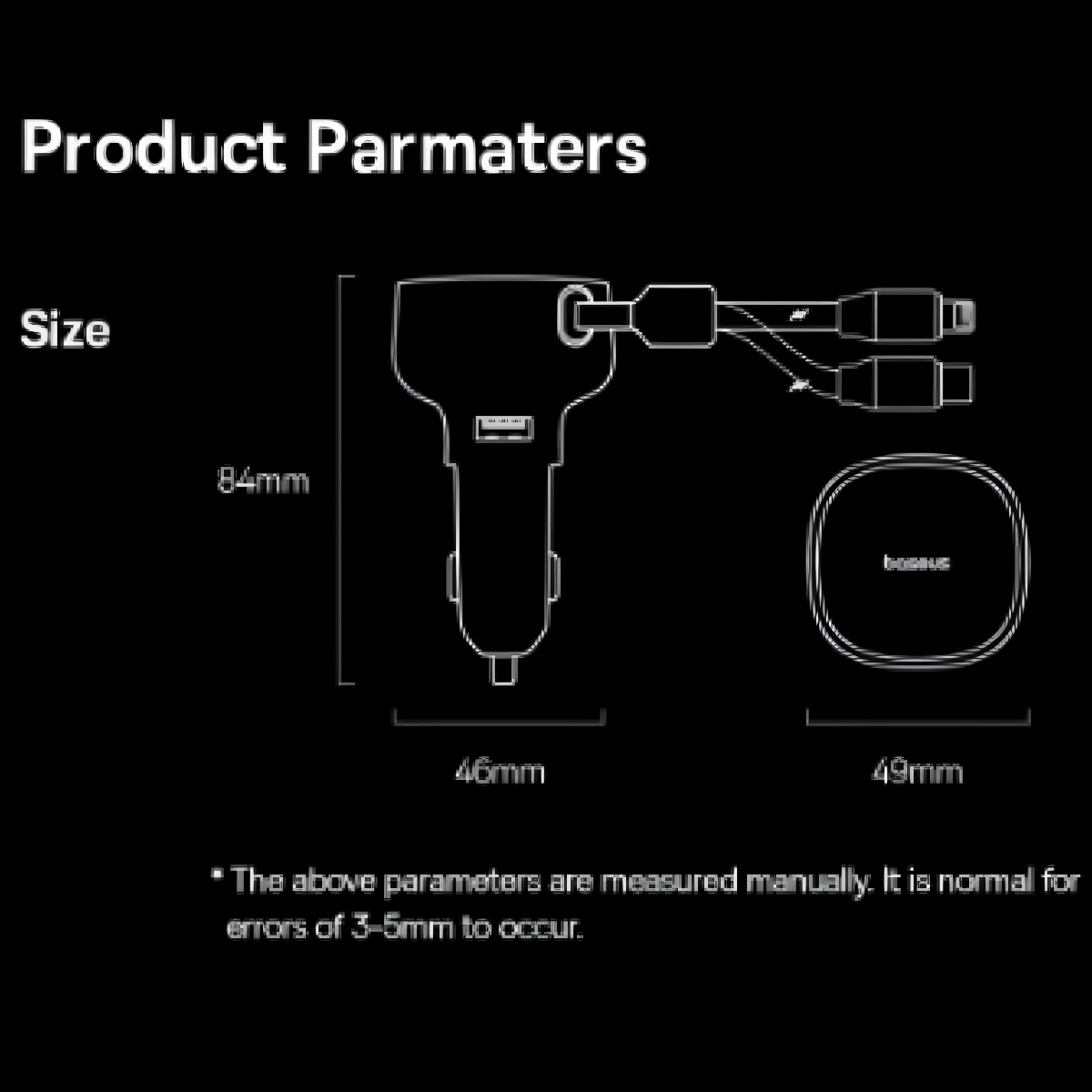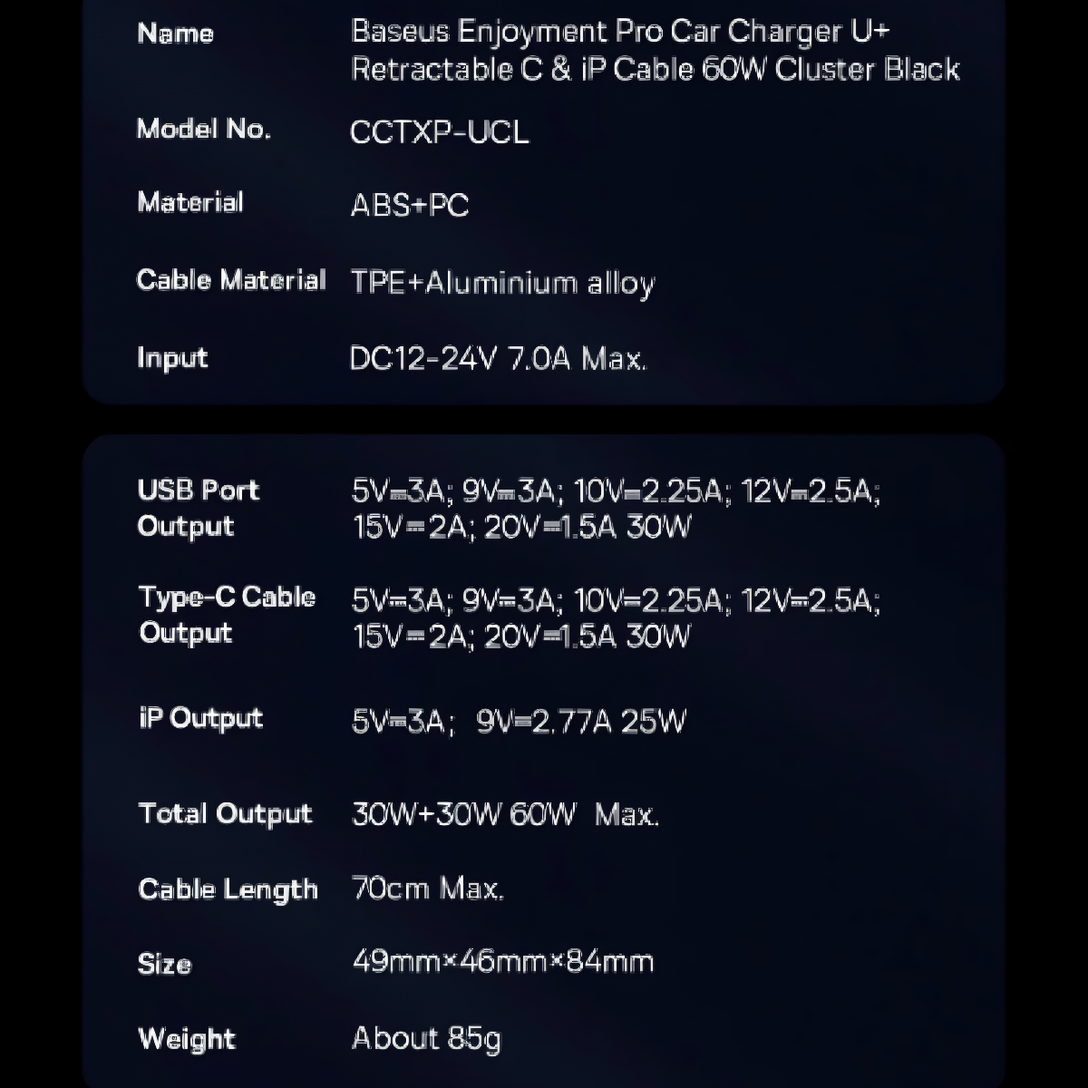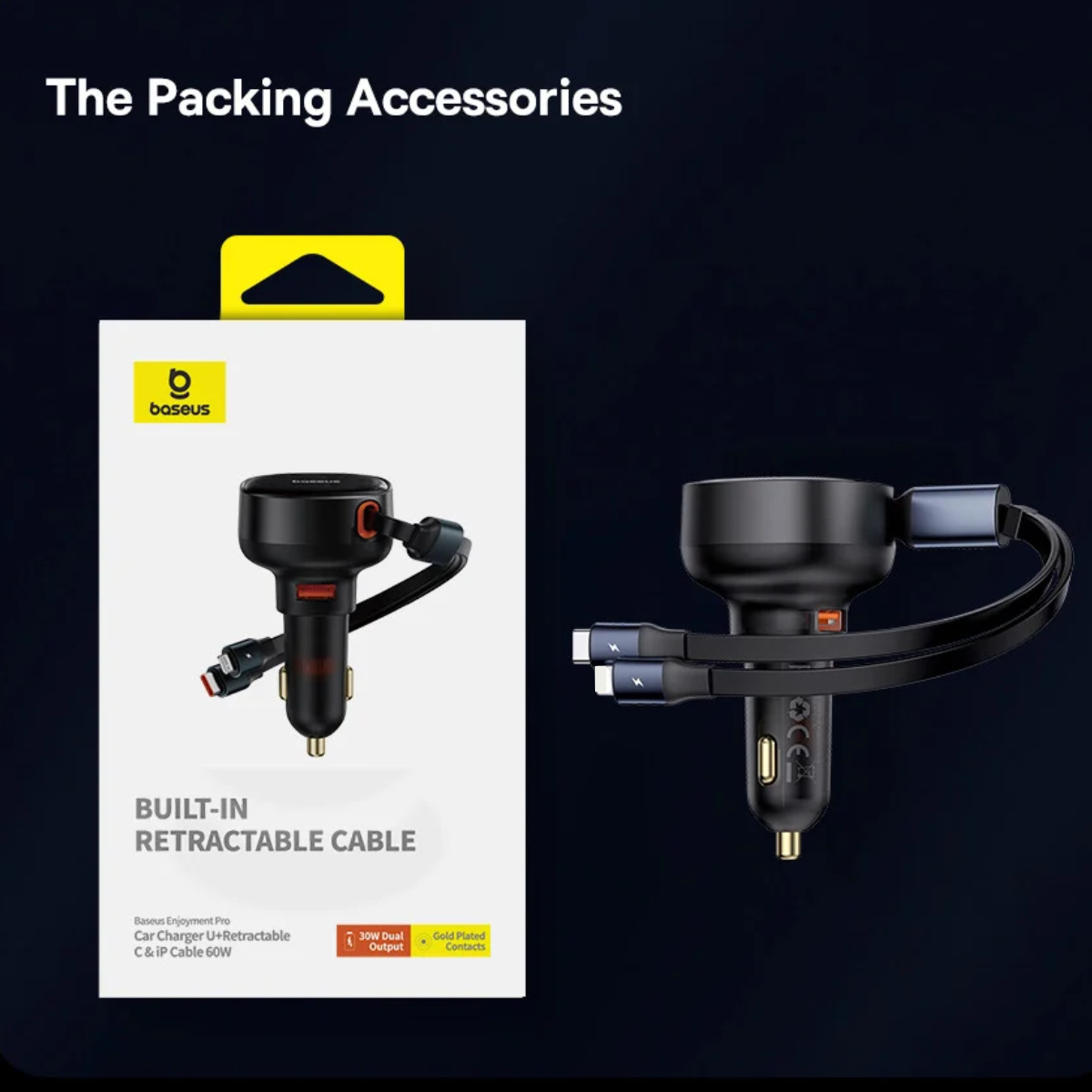 - Baseus Enjoyment Pro Car Charger có thể cung cấp đến 55W công suất sạc, đồng thời tích hợp một cáp sạc Lightning, Type C có thể thu gọn vào bên trong sản phẩm, giúp tiết kiệm không gian và giữ gọn gàng khi không sử dụng. Nó cũng hỗ trợ nhiều giao thức sạc nhanh như Power Delivery và Quick Charge, giúp sạc nhanh cho các thiết bị di động như điện thoại, máy tính bảng và laptop.