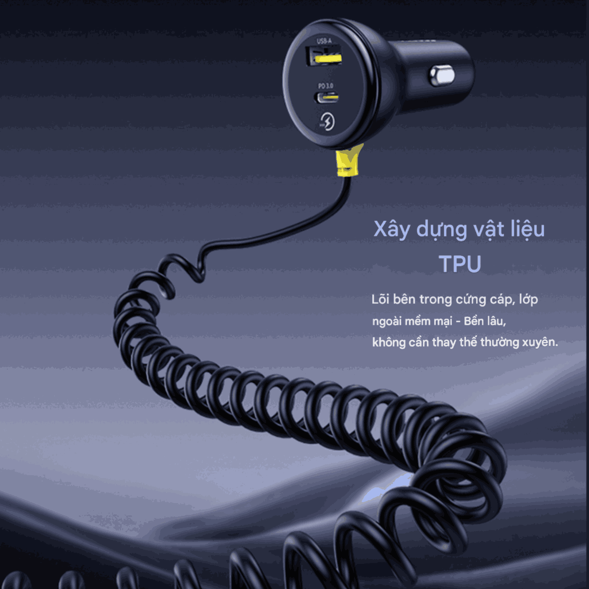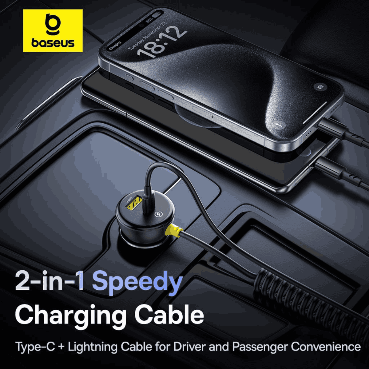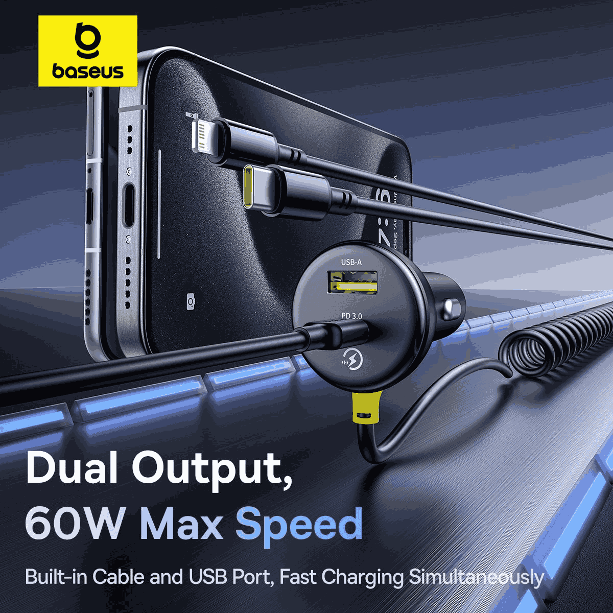 Tính năng Tẩu sạc nhanh 2 cổng trên ô tô 60W Baseus Circular Plastic Car Charger tích hợp cáp lò xo Type C và Ligtning