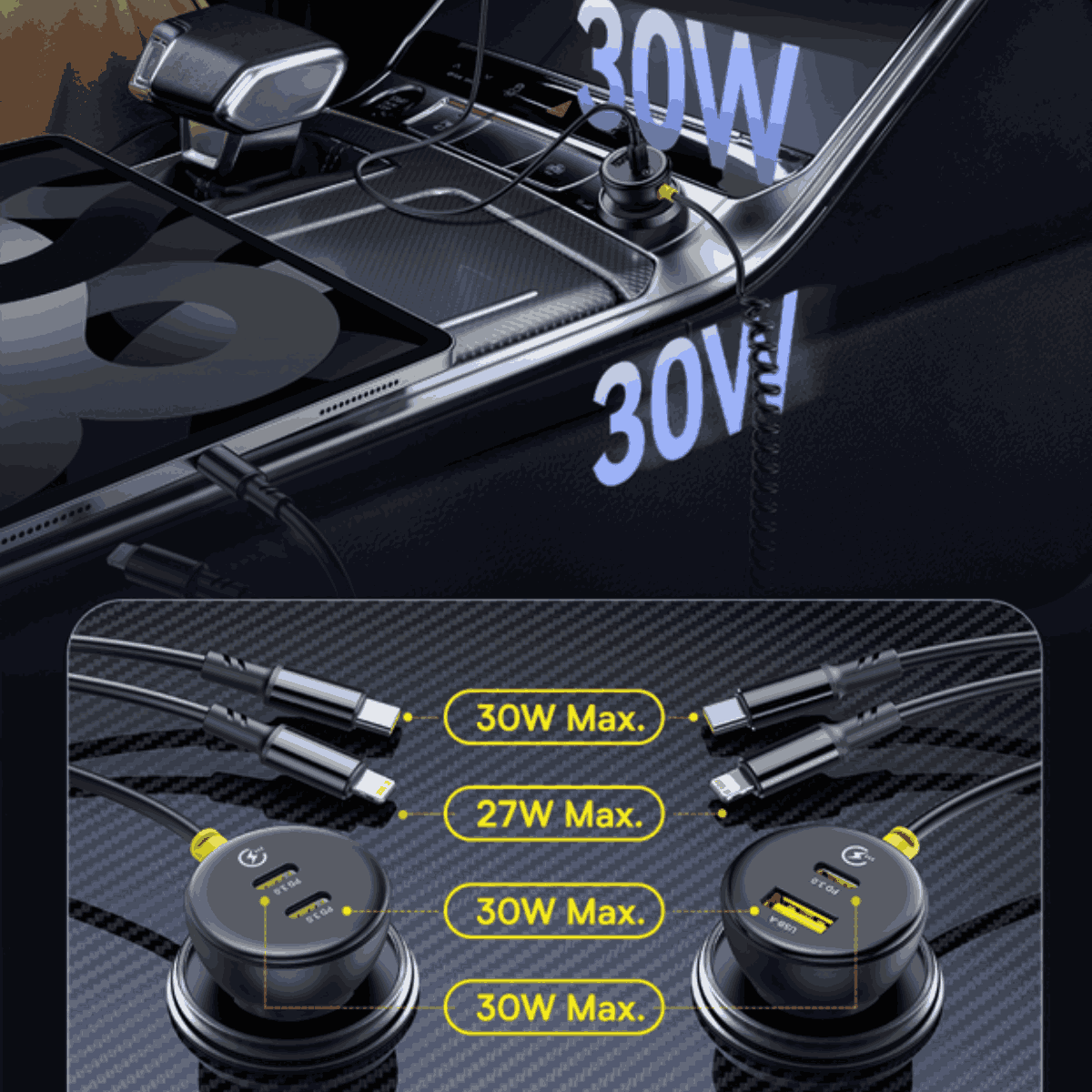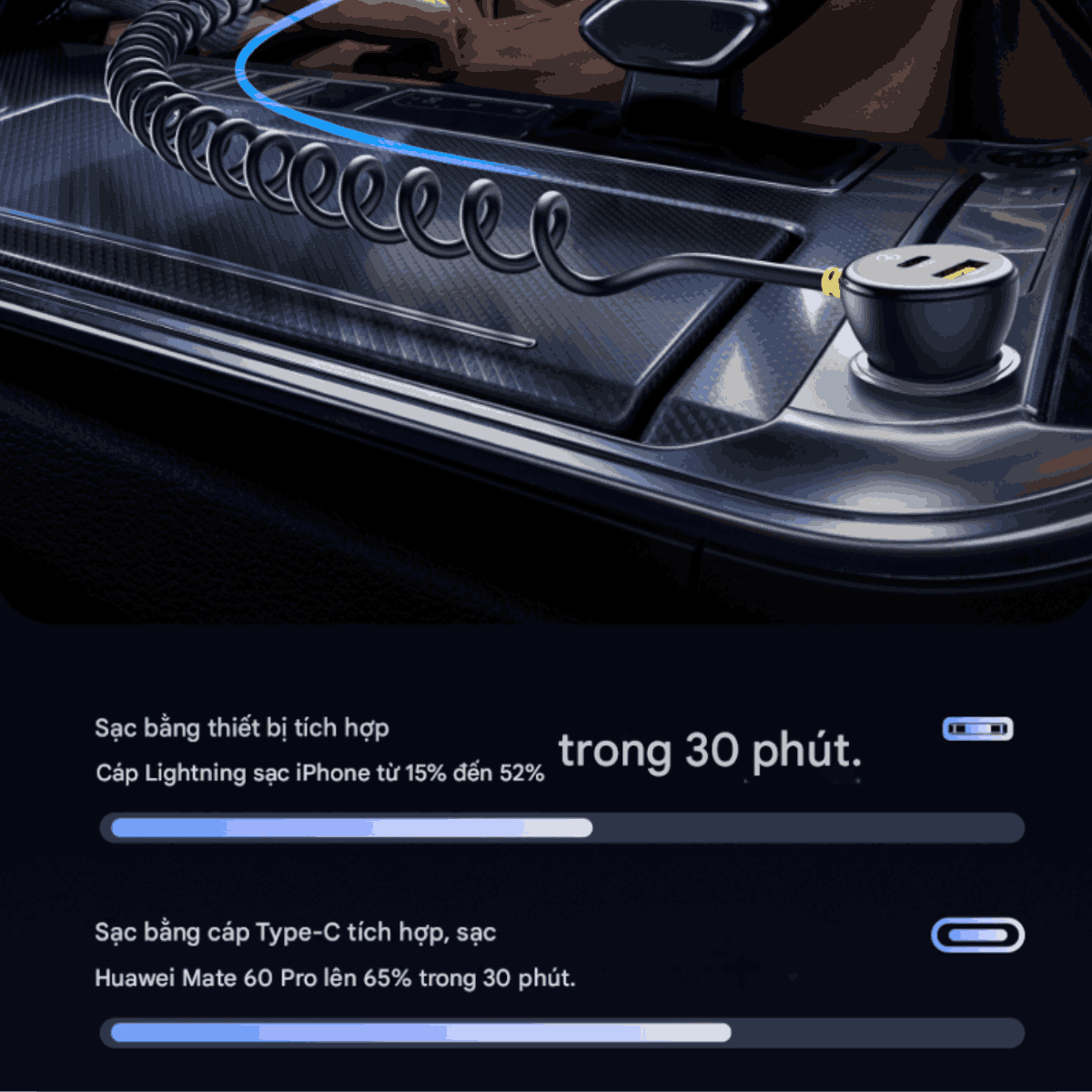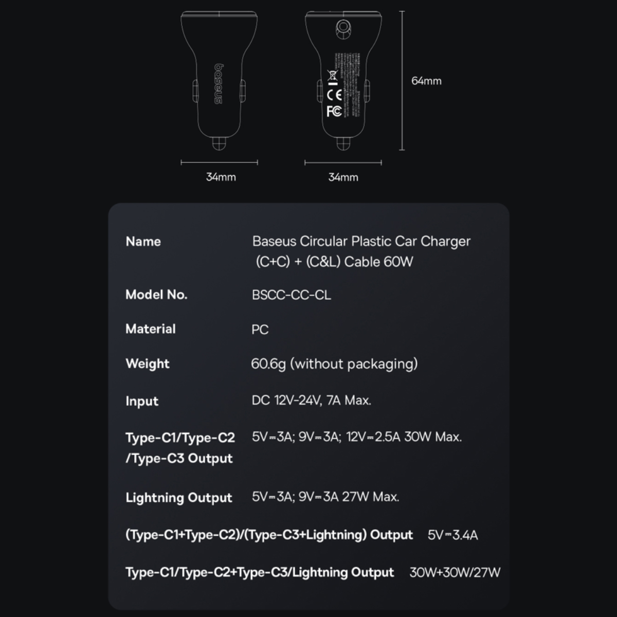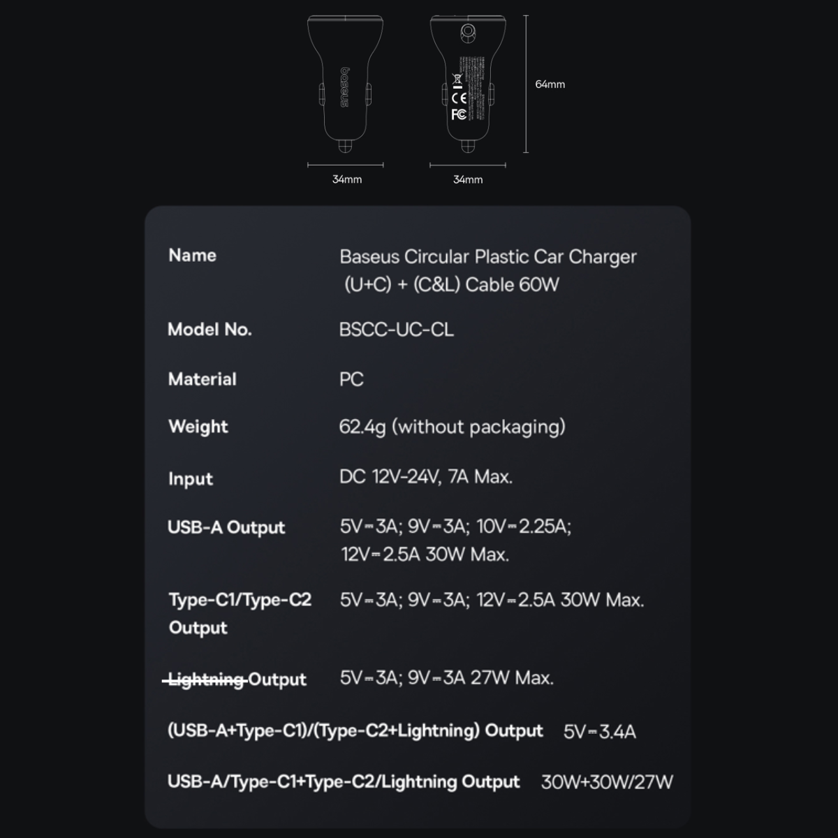 Tính năng Tẩu sạc nhanh 2 cổng trên ô tô 60W Baseus Circular Plastic Car Charger tích hợp cáp lò xo Type C và Ligtning