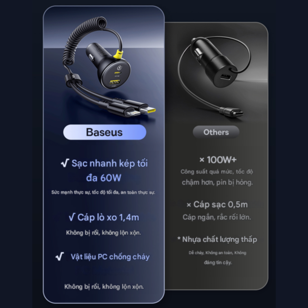 - Tẩu sạc Baseus tích hợp nhiều cơ chế bảo vệ như quá dòng, quá nhiệt, và ngắn mạch, đảm bảo thiết bị và xe của bạn luôn được an toàn trong quá trình sạc.